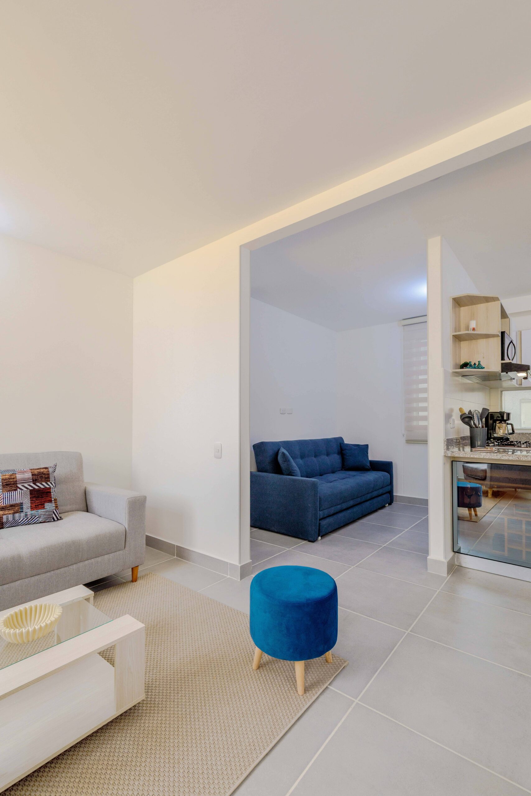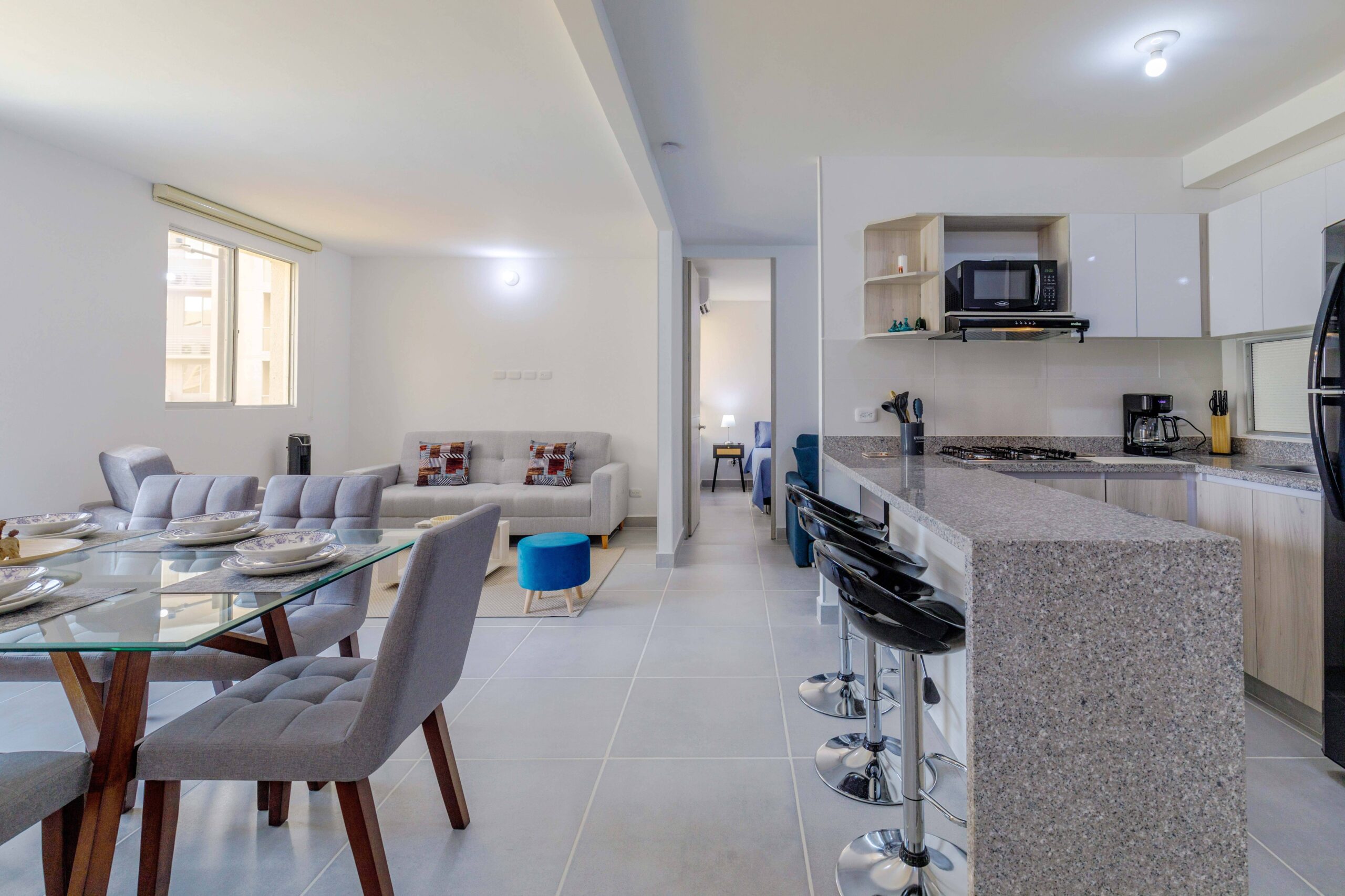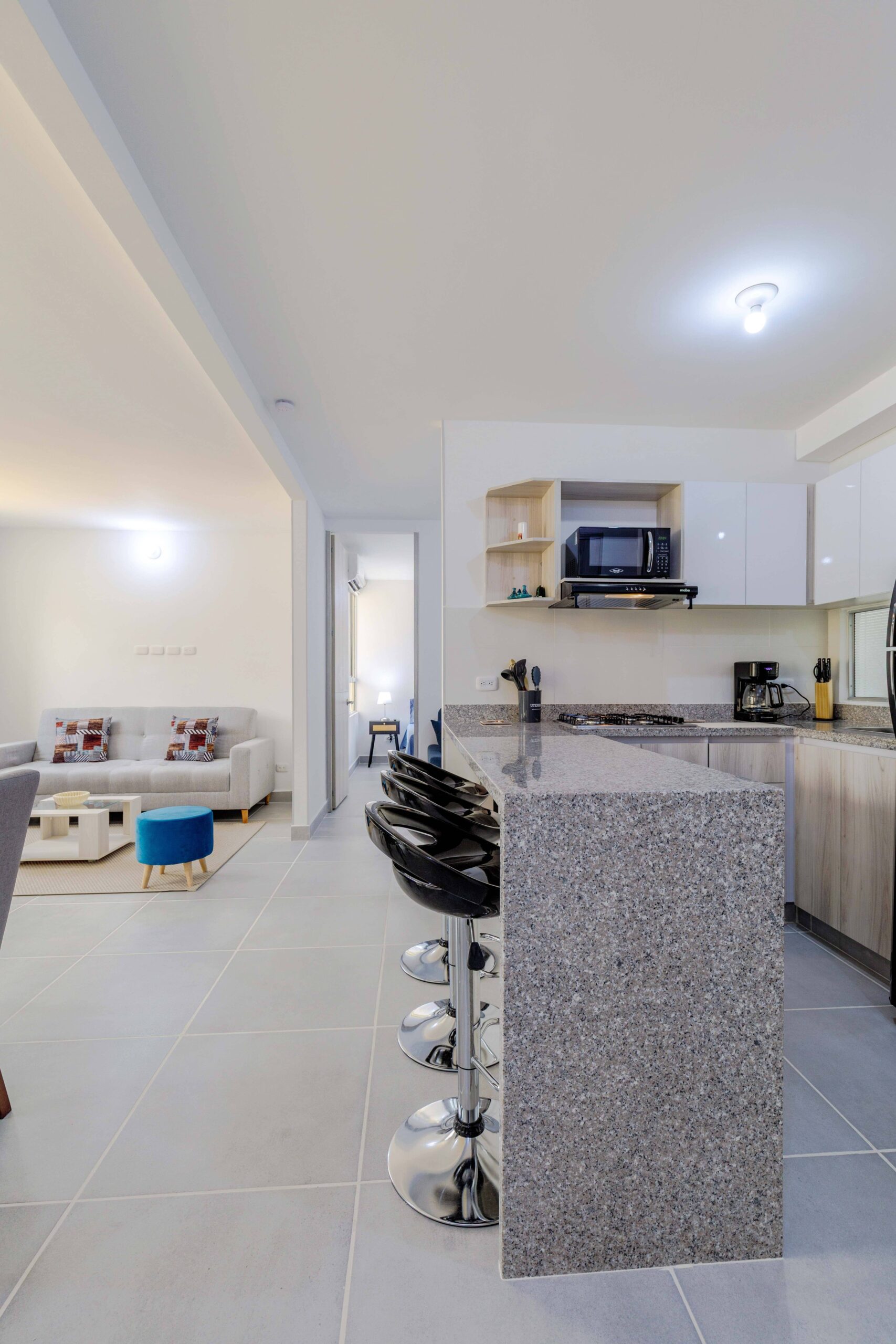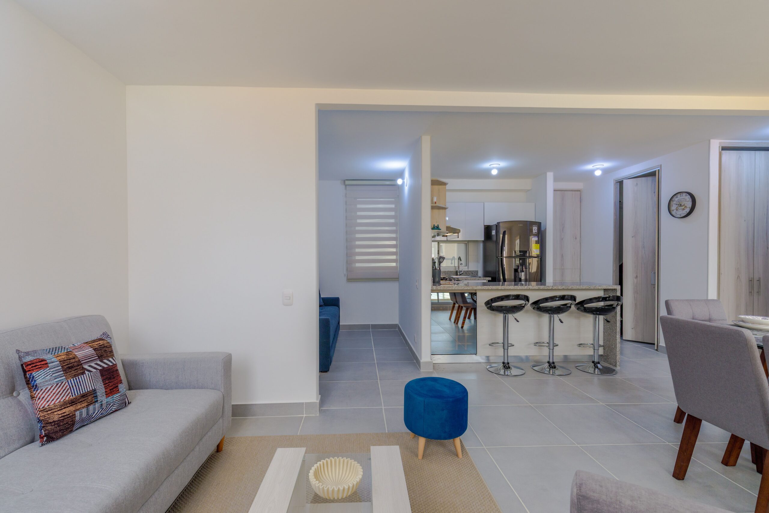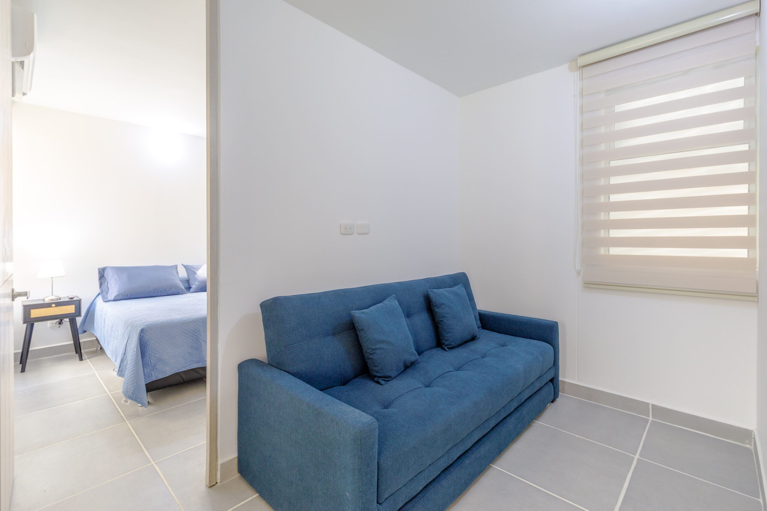 Al salir de la habitación auxiliar, encontrarás una amplia sala-comedor que conecta con una zona de estudio equipada con un sofá cama tipo nido, ideal para visitas o para quienes necesiten un espacio adicional. La habitación principal, ubicada al final del pasillo, incluye su propio baño privado, aire acondicionado y un elegante walking closet, brindando el máximo confort y privacidad.