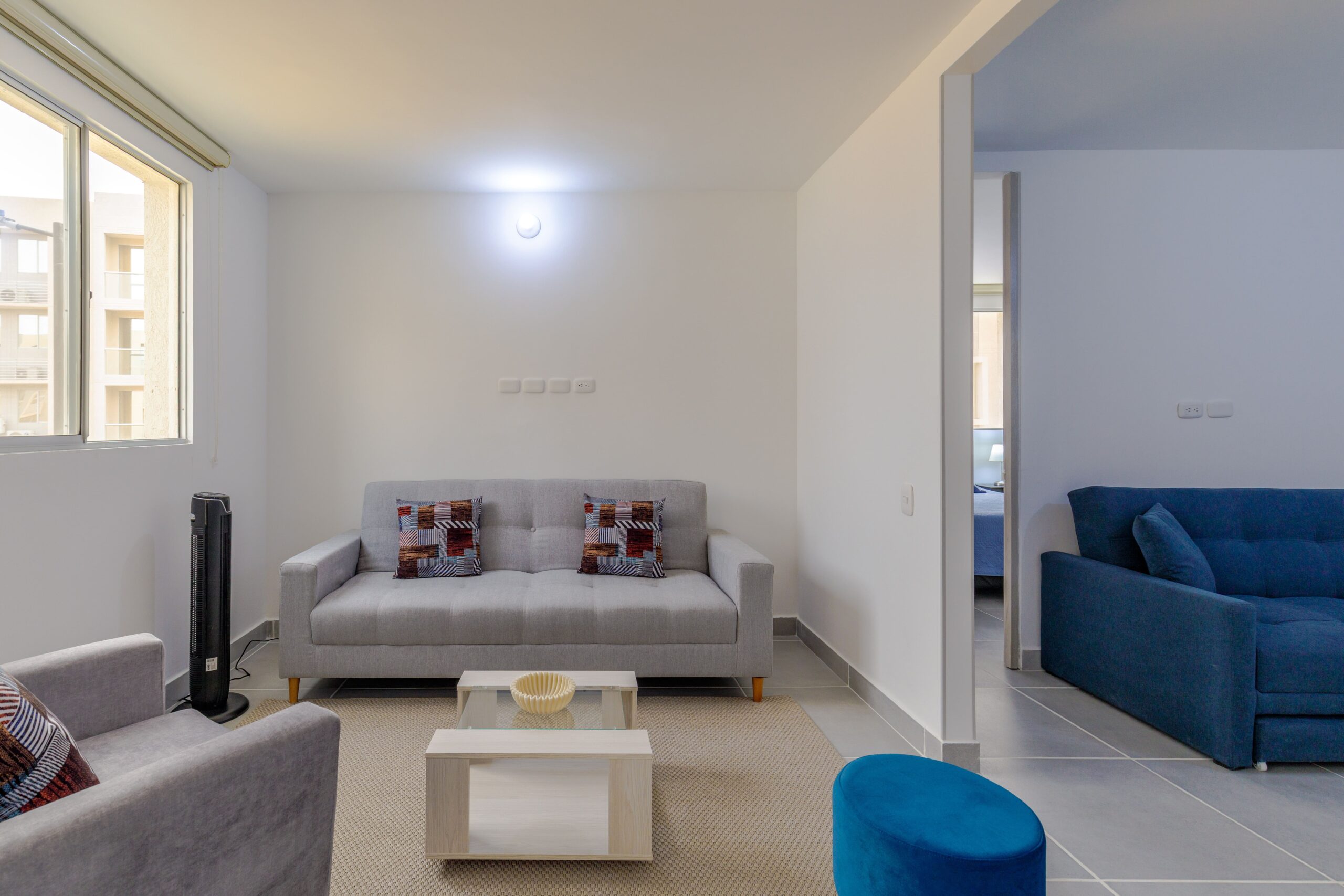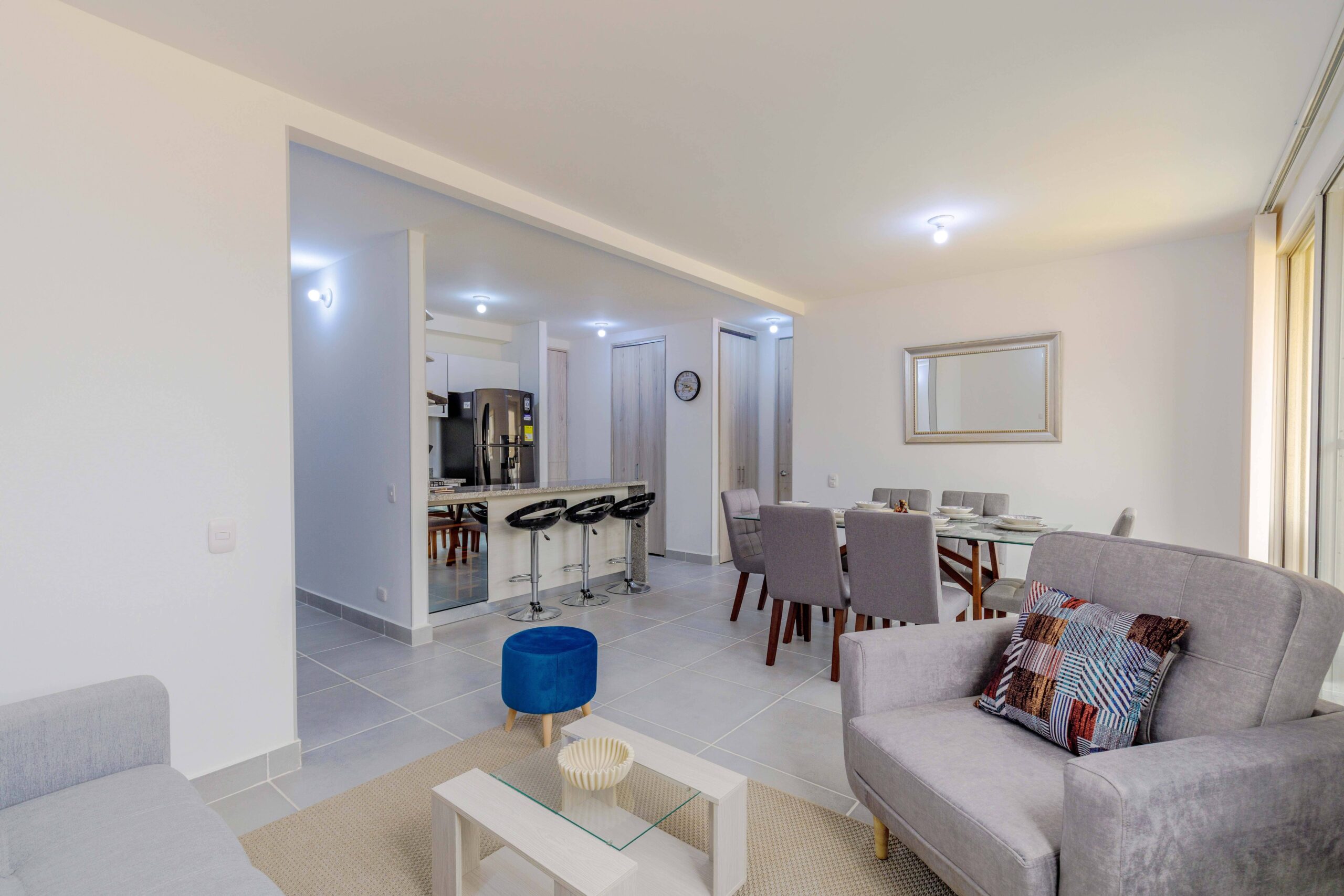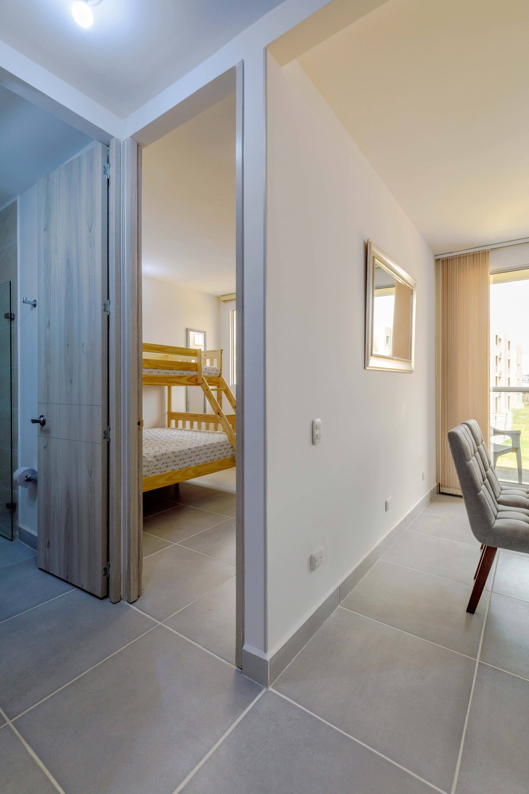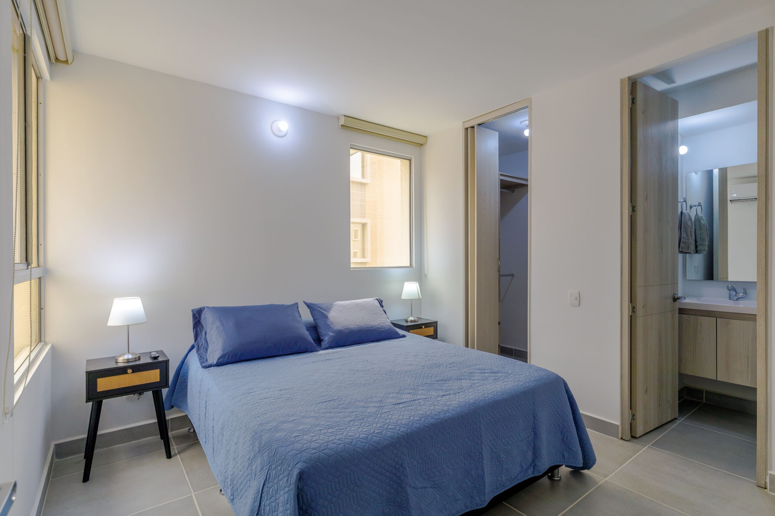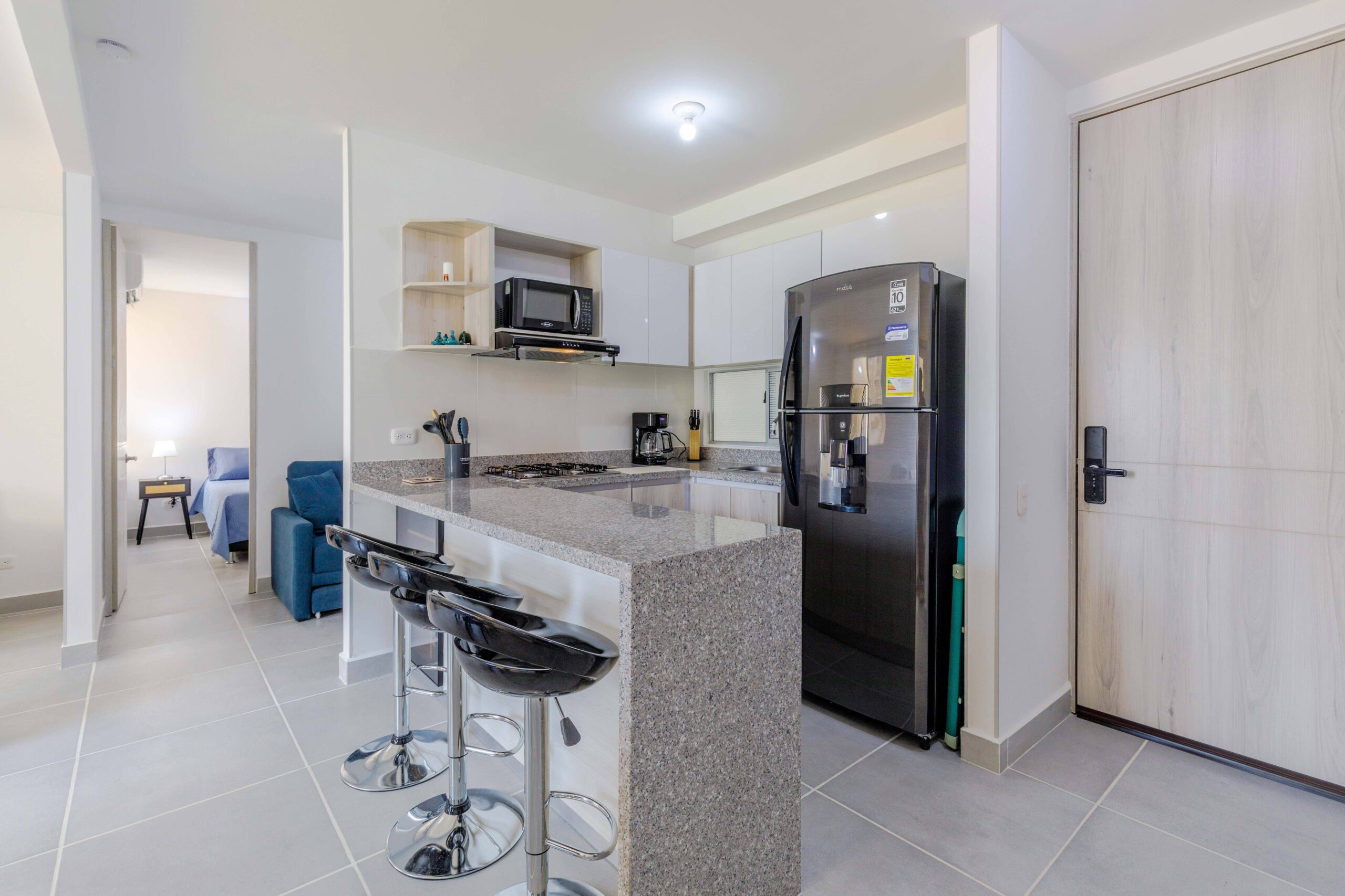 Al salir de la habitación auxiliar, encontrarás una amplia sala-comedor que conecta con una zona de estudio equipada con un sofá cama tipo nido, ideal para visitas o para quienes necesiten un espacio adicional. La habitación principal, ubicada al final del pasillo, incluye su propio baño privado, aire acondicionado y un elegante walking closet, brindando el máximo confort y privacidad.