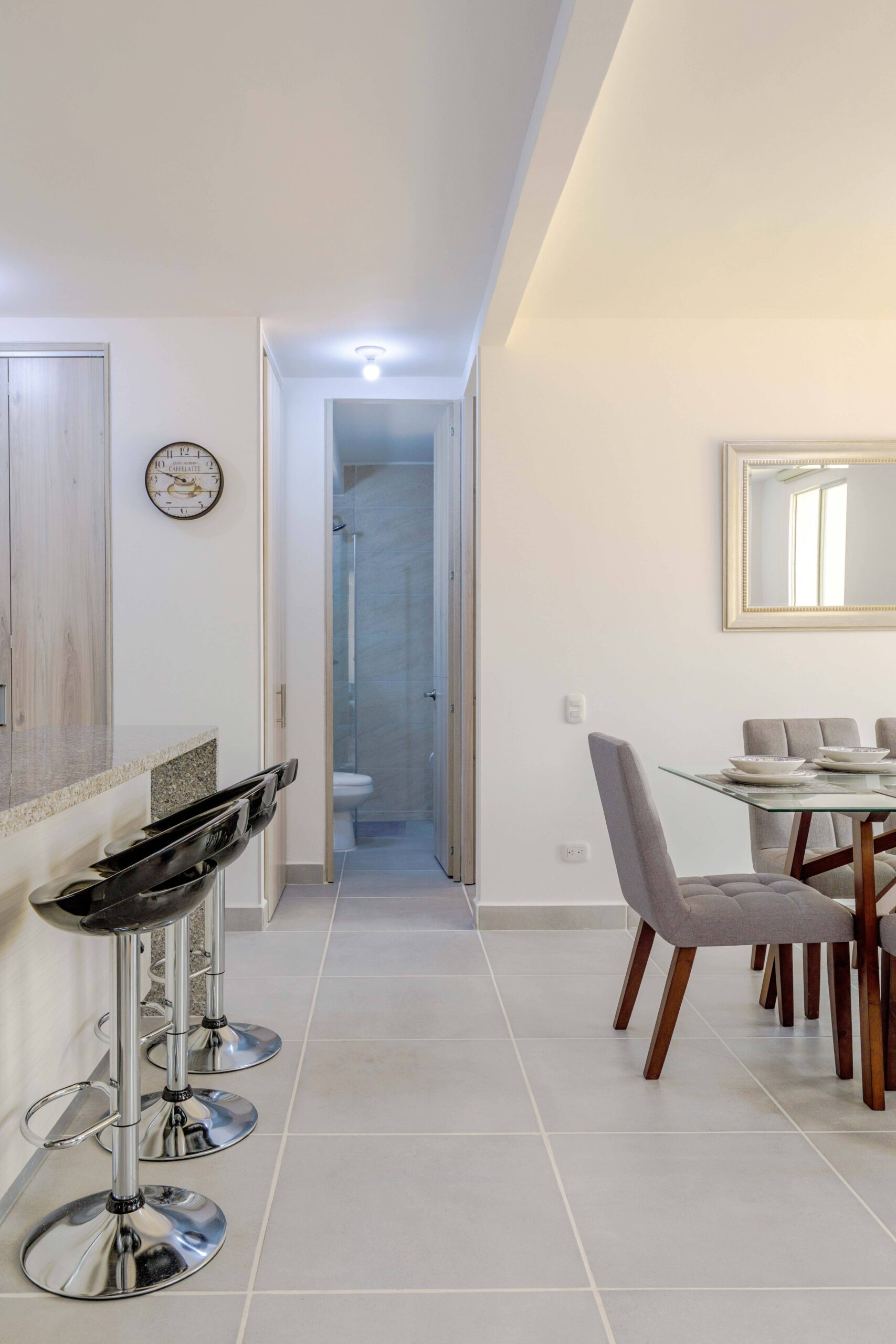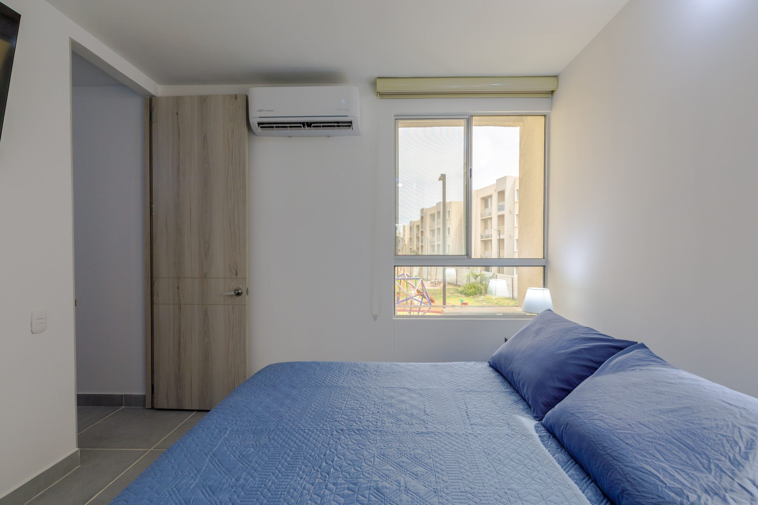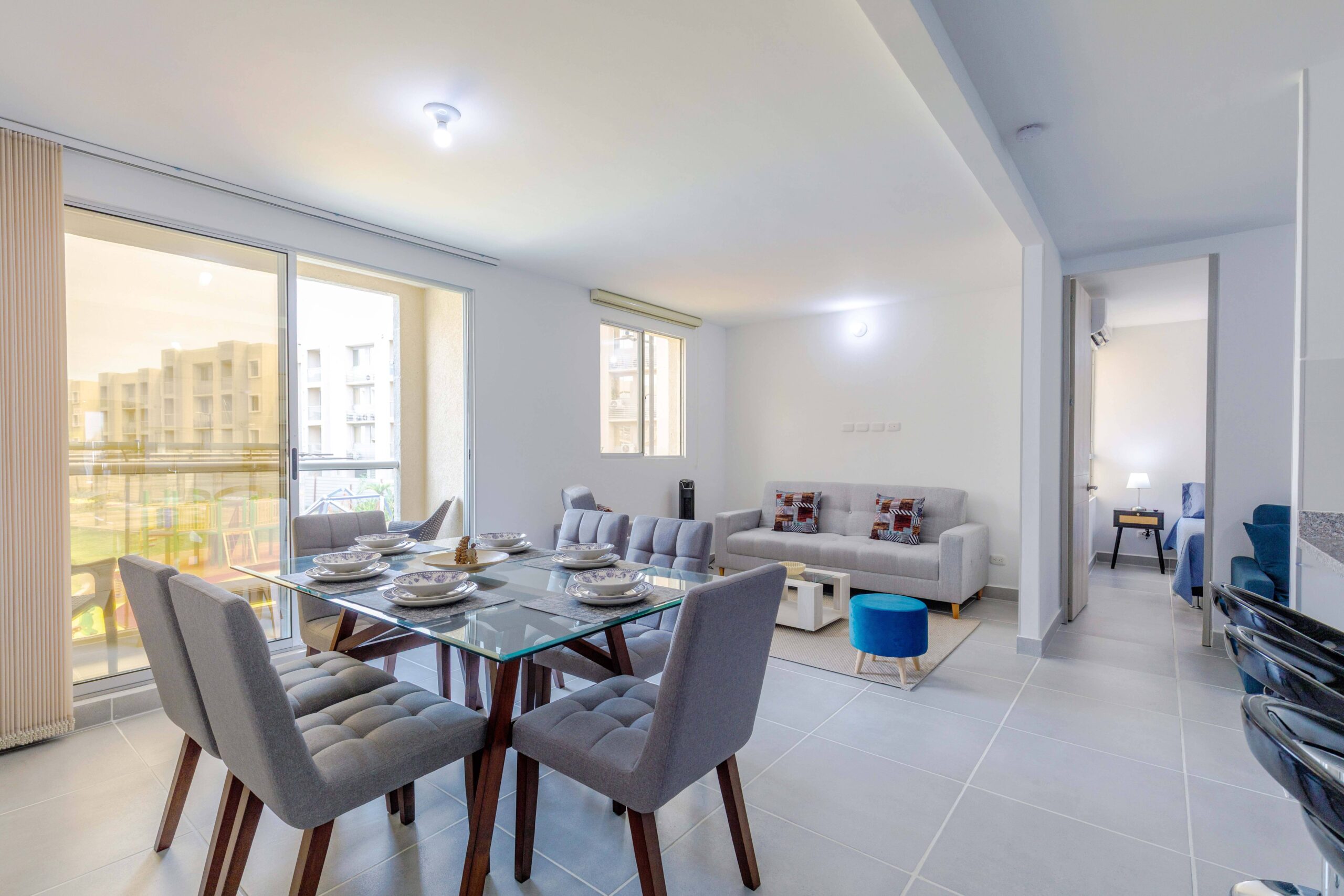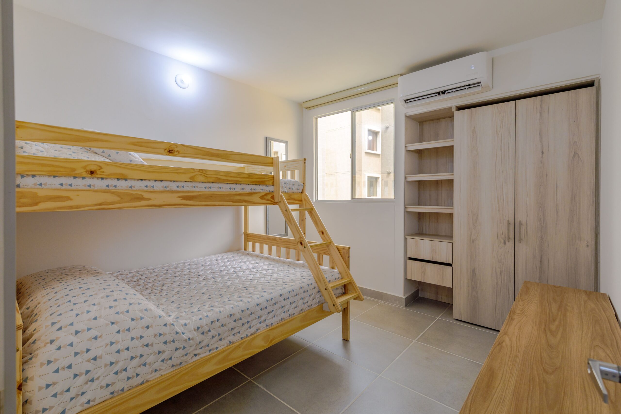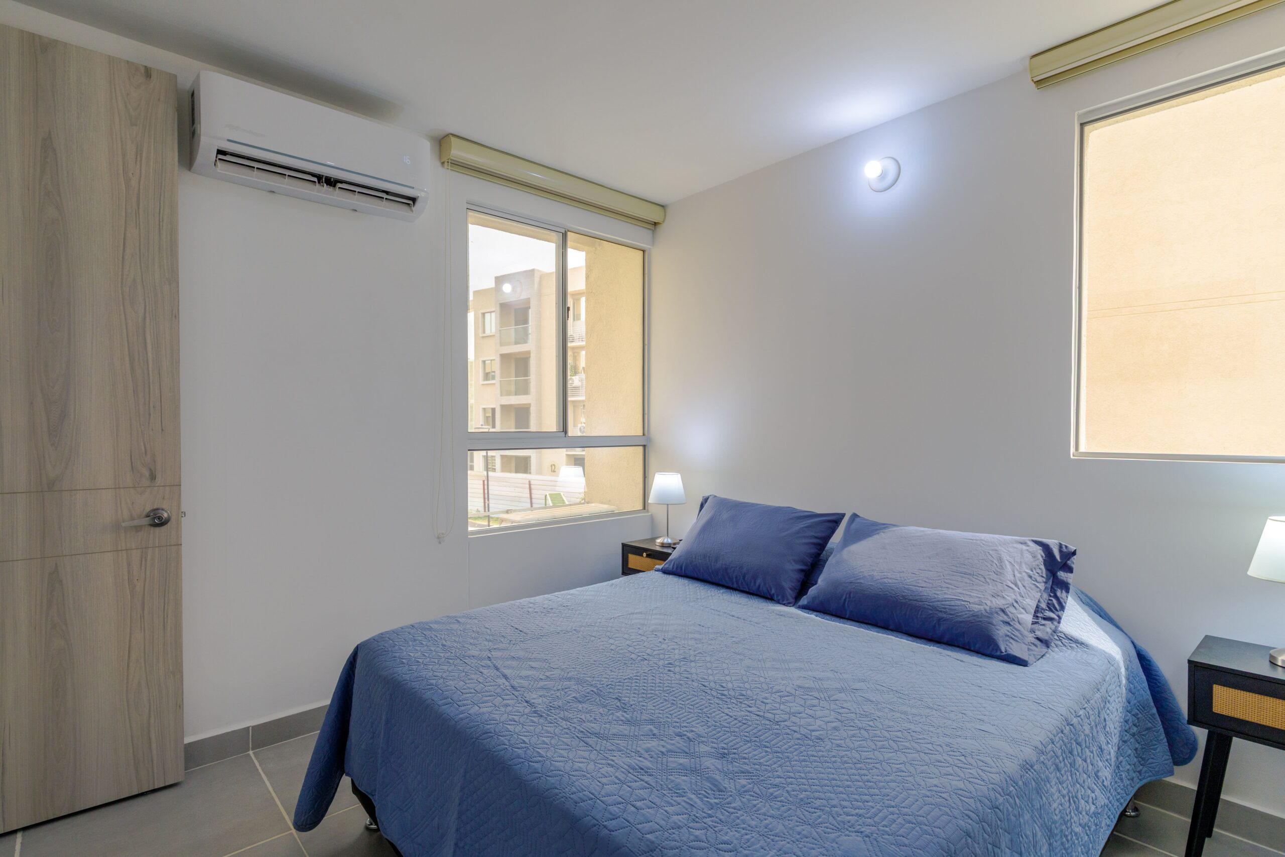 Al salir de la habitación auxiliar, encontrarás una amplia sala-comedor que conecta con una zona de estudio equipada con un sofá cama tipo nido, ideal para visitas o para quienes necesiten un espacio adicional. La habitación principal, ubicada al final del pasillo, incluye su propio baño privado, aire acondicionado y un elegante walking closet, brindando el máximo confort y privacidad.