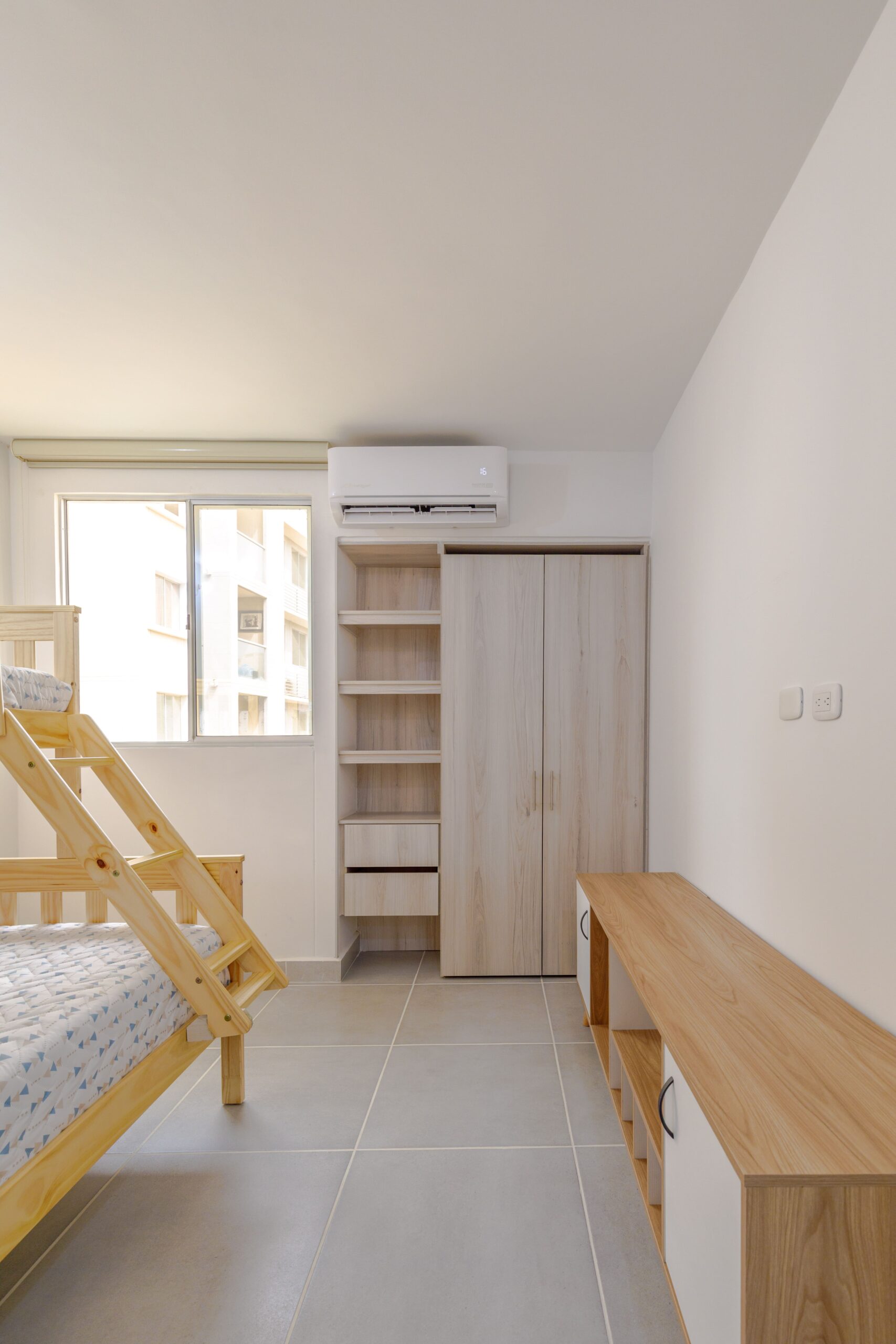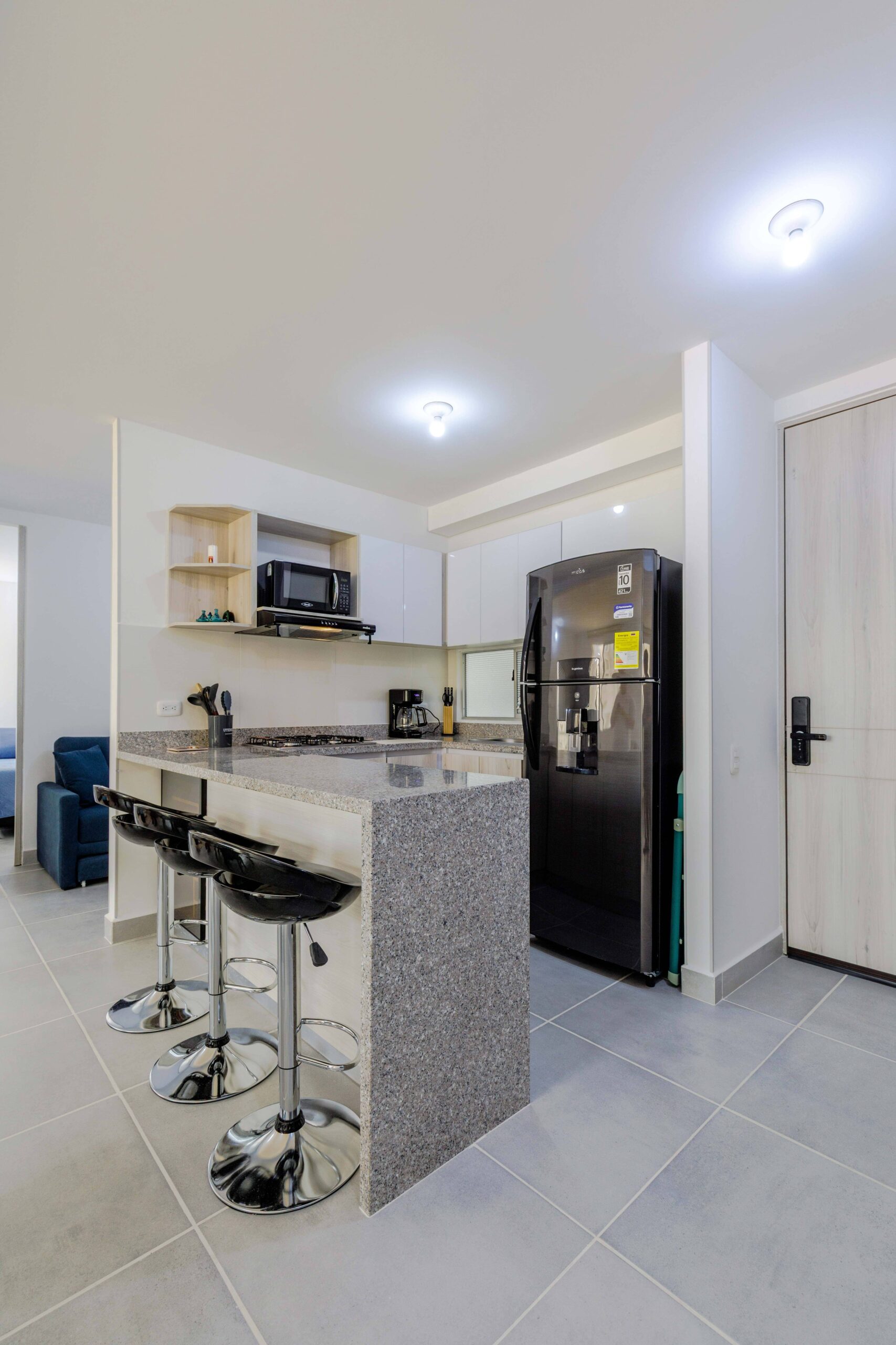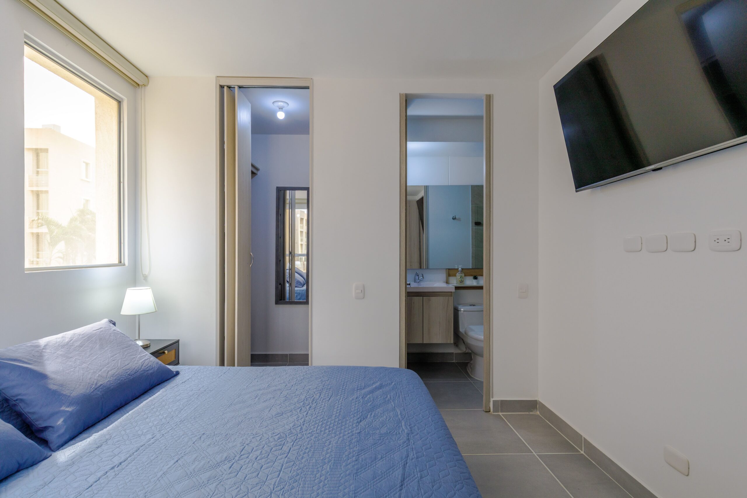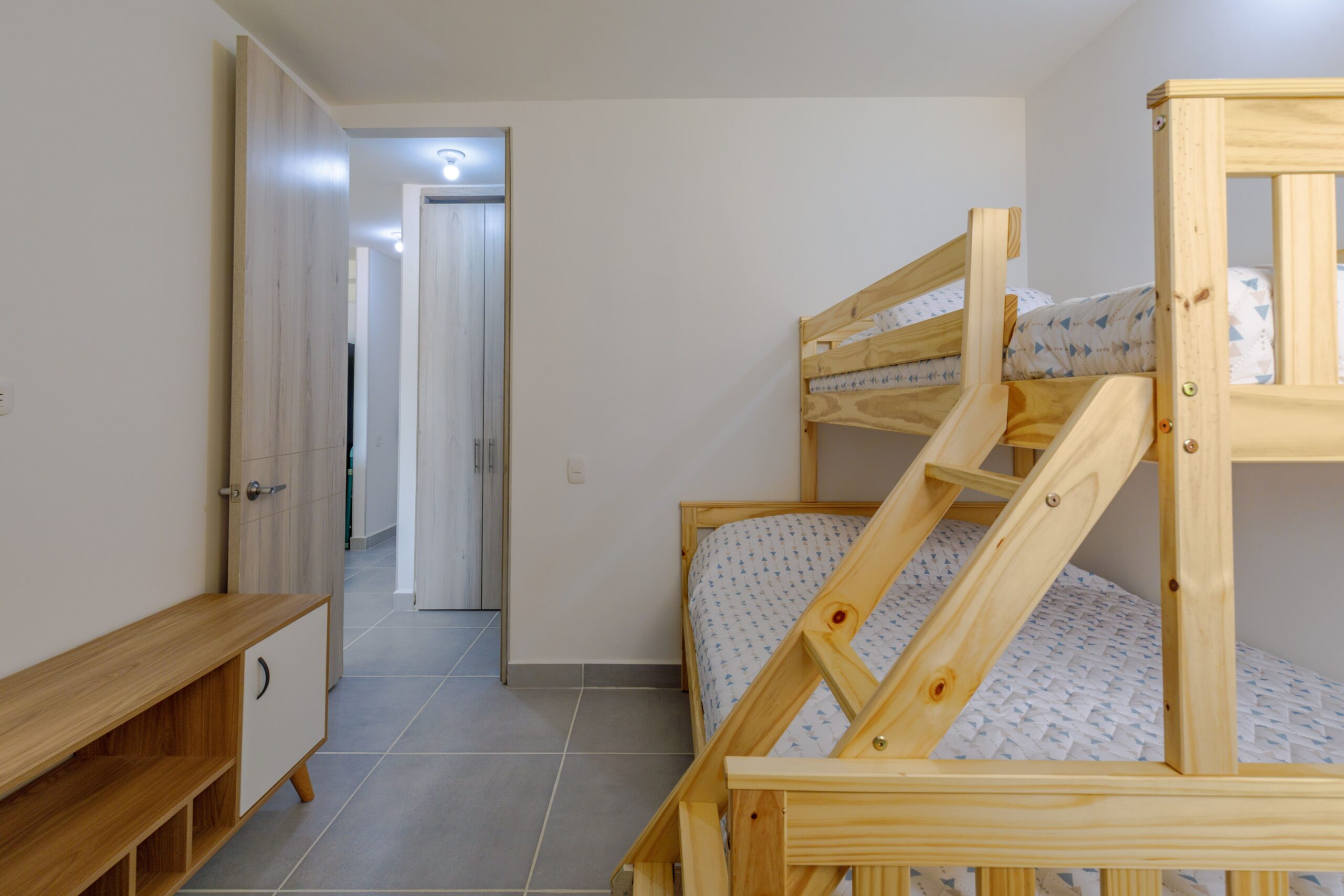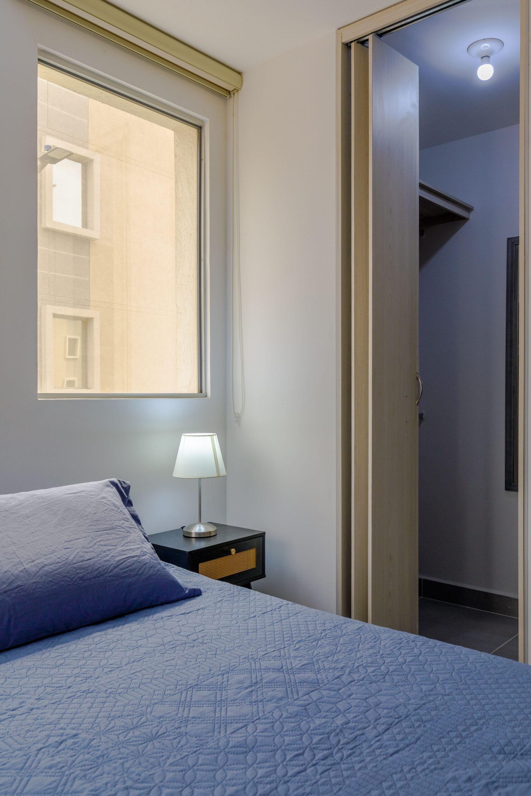 Al salir de la habitación auxiliar, encontrarás una amplia sala-comedor que conecta con una zona de estudio equipada con un sofá cama tipo nido, ideal para visitas o para quienes necesiten un espacio adicional. La habitación principal, ubicada al final del pasillo, incluye su propio baño privado, aire acondicionado y un elegante walking closet, brindando el máximo confort y privacidad.