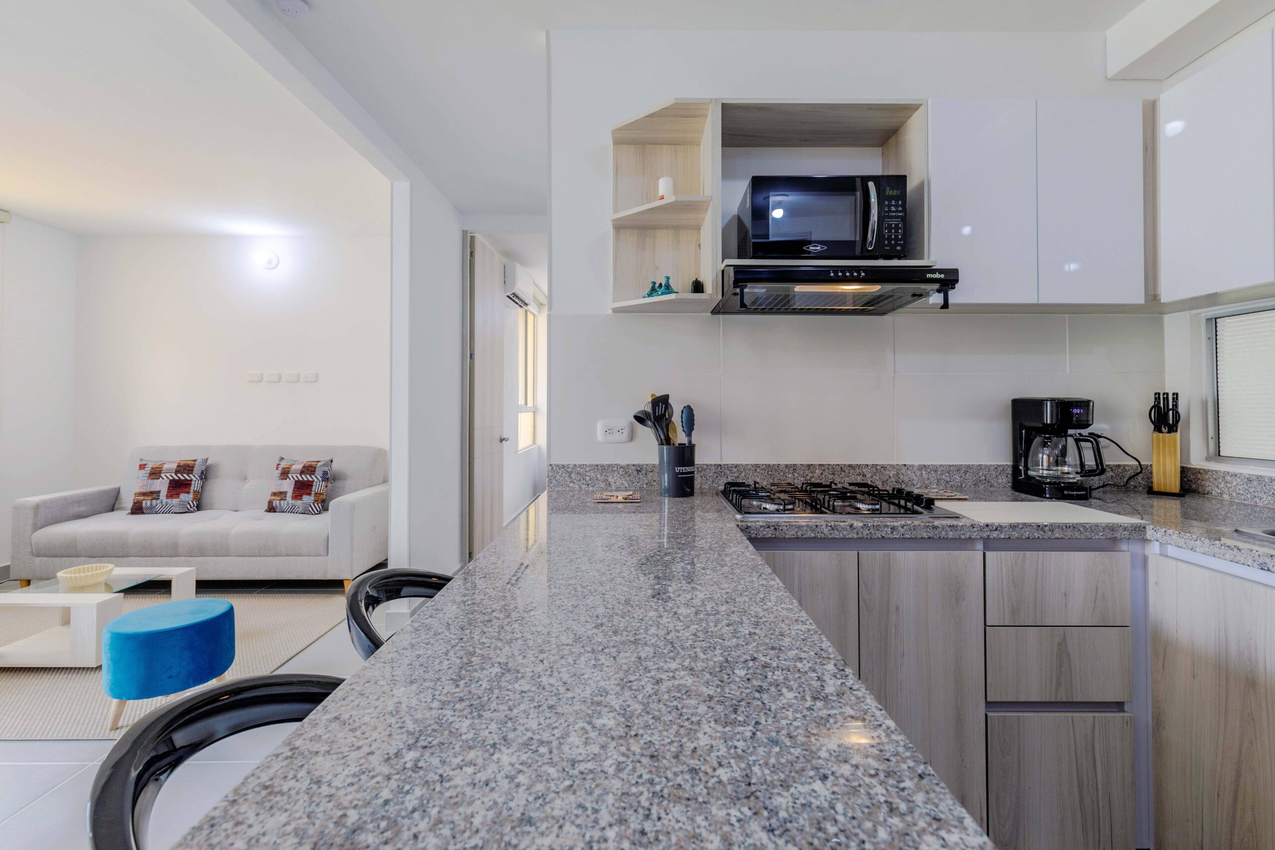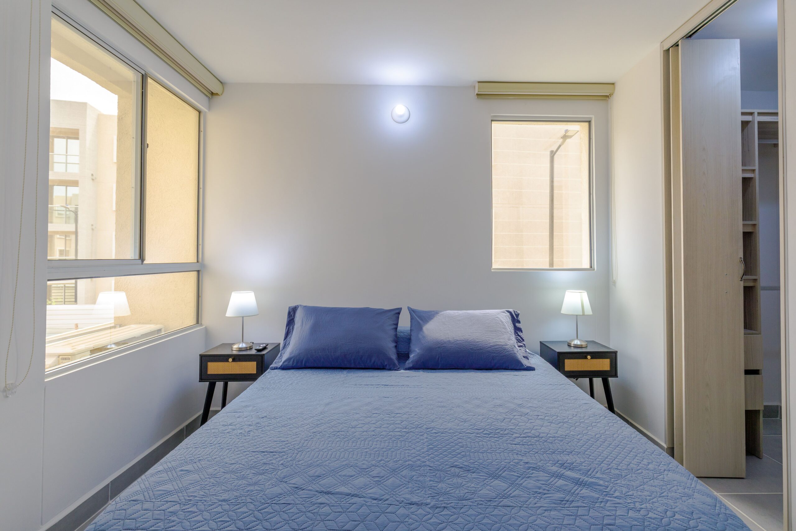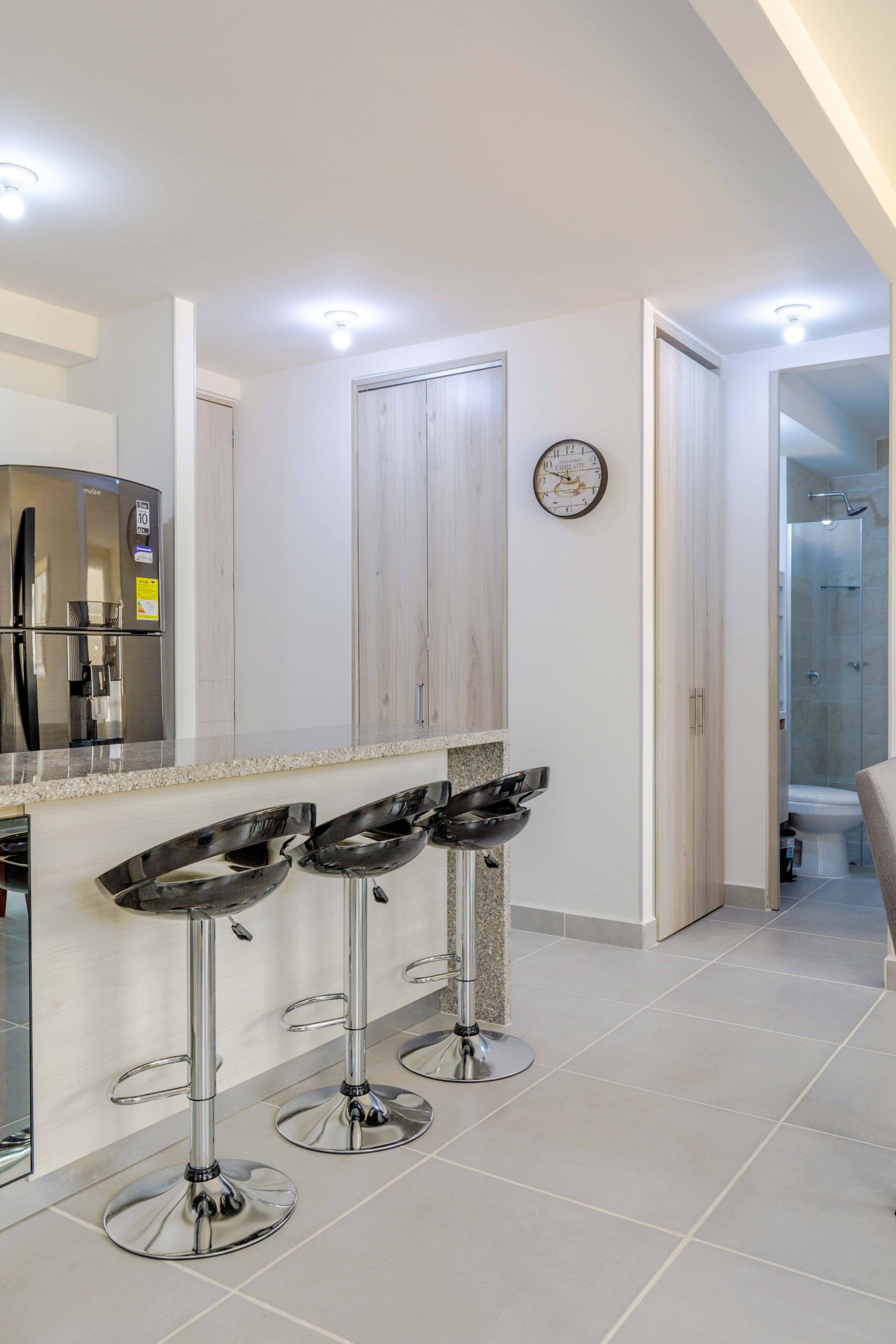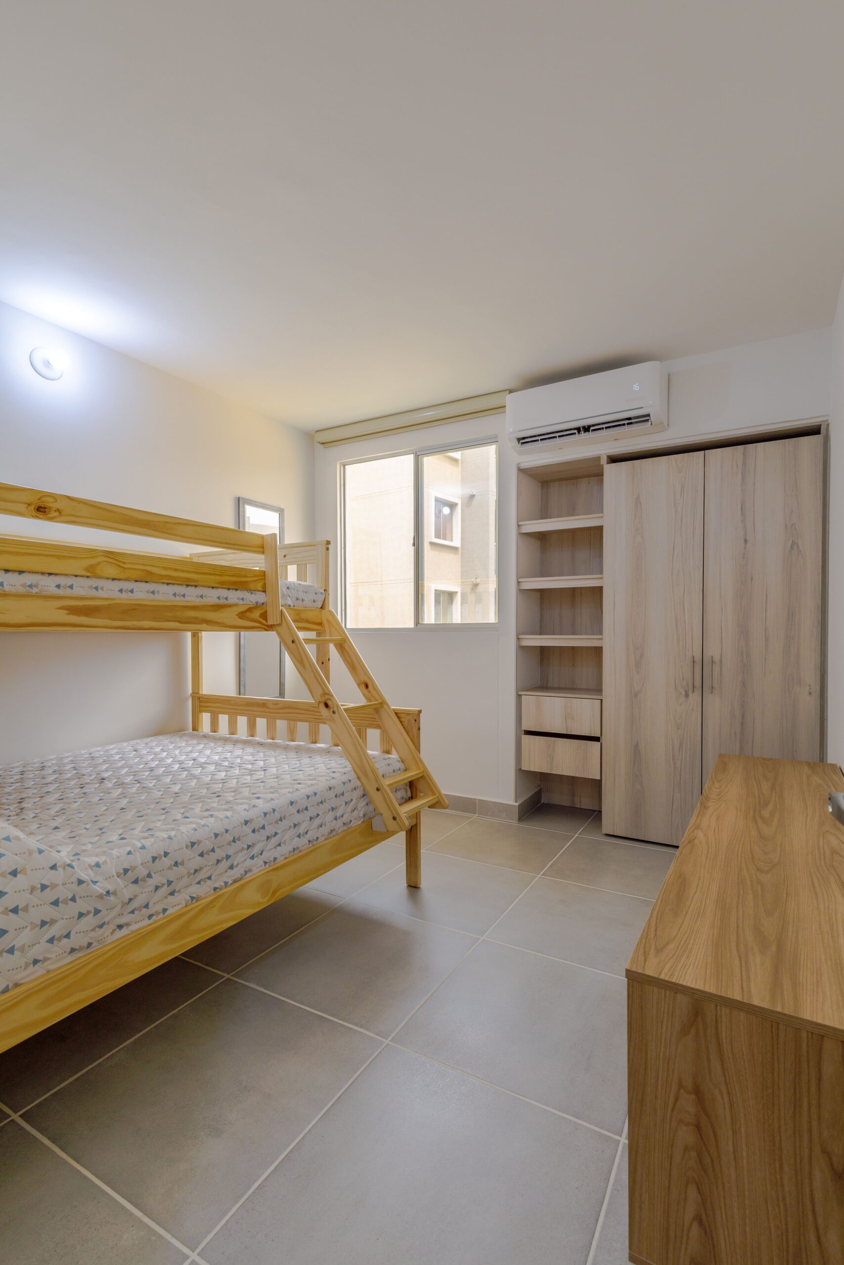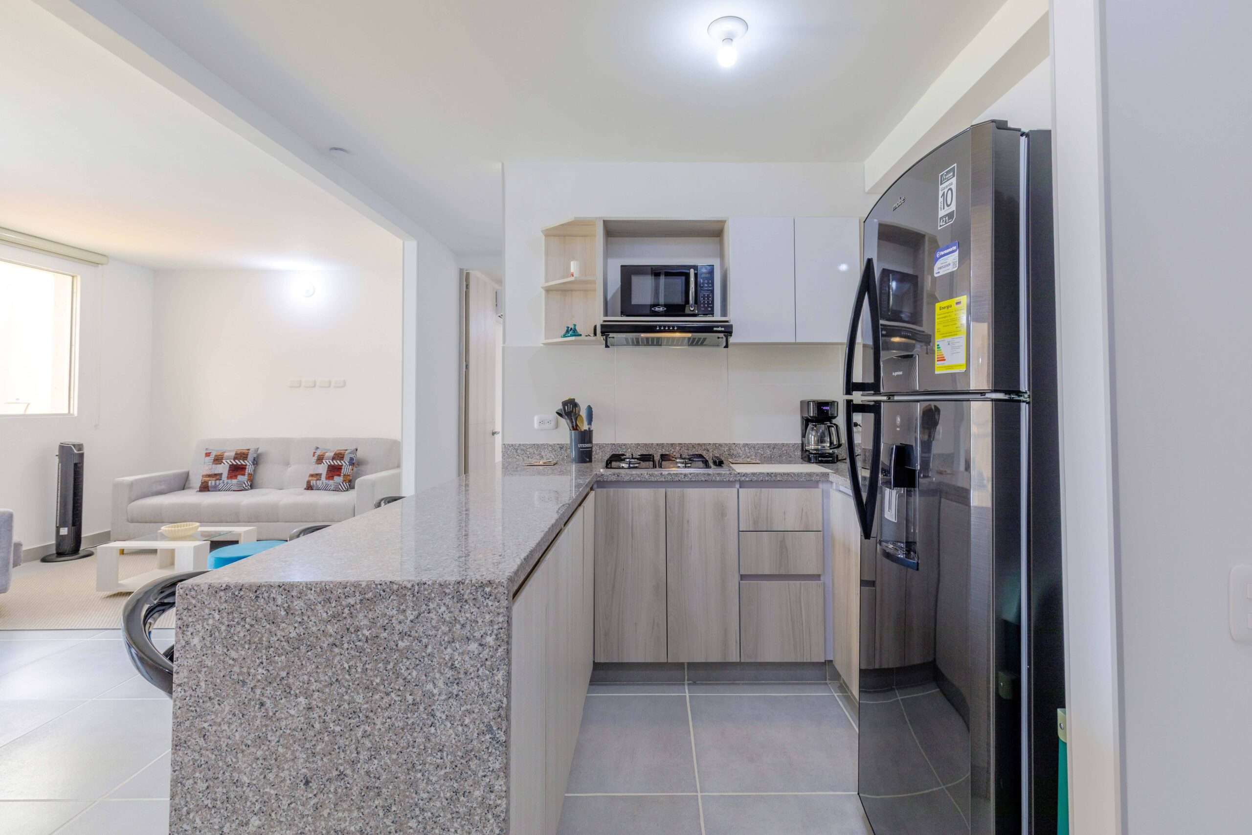Al salir de la habitación auxiliar, encontrarás una amplia sala-comedor que conecta con una zona de estudio equipada con un sofá cama tipo nido, ideal para visitas o para quienes necesiten un espacio adicional. La habitación principal, ubicada al final del pasillo, incluye su propio baño privado, aire acondicionado y un elegante walking closet, brindando el máximo confort y privacidad.