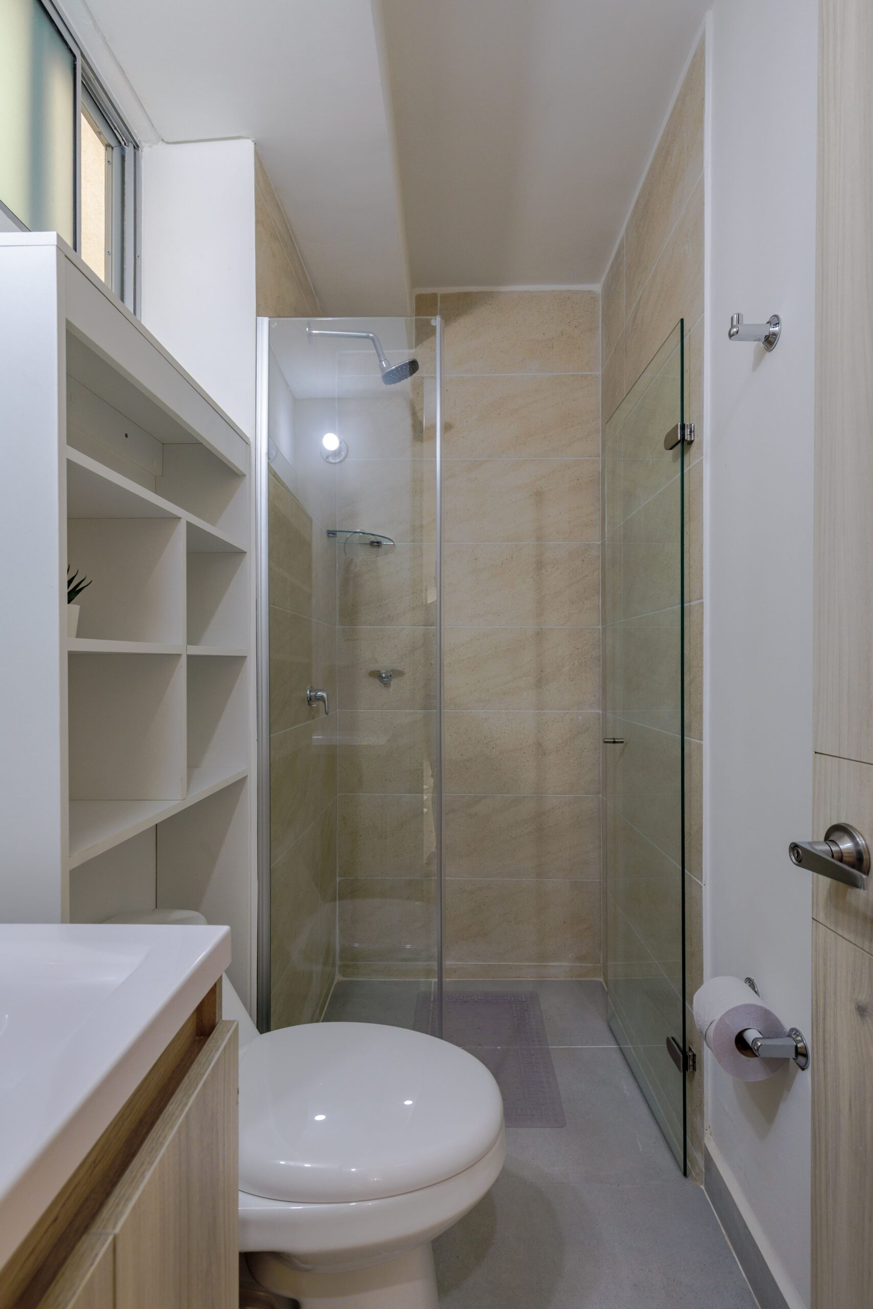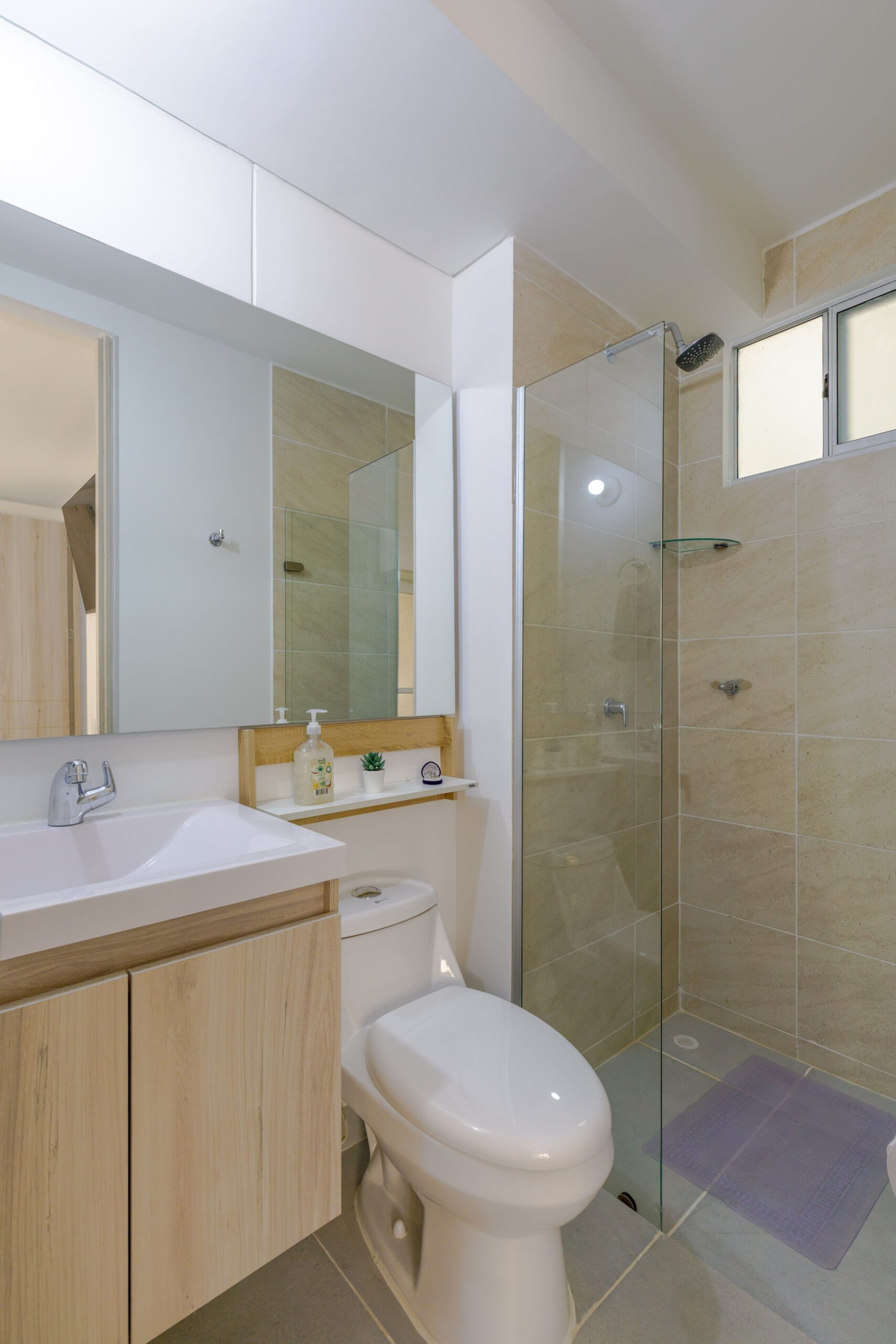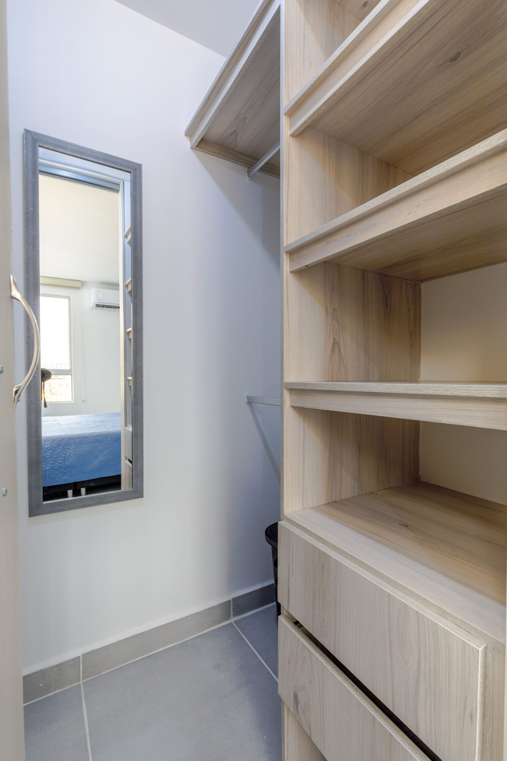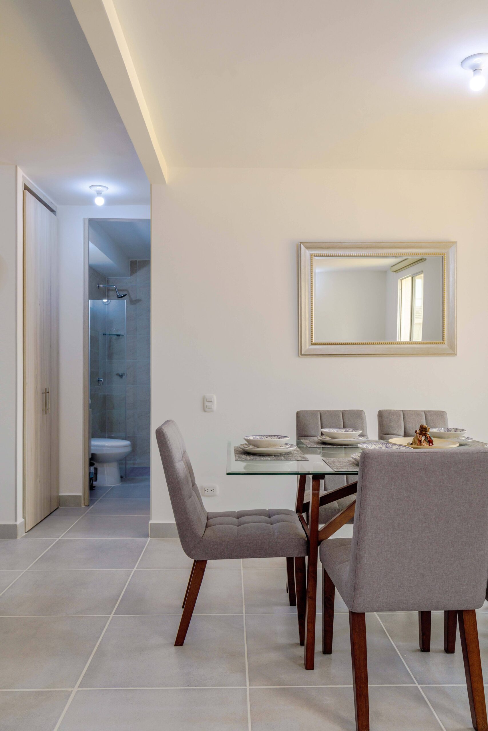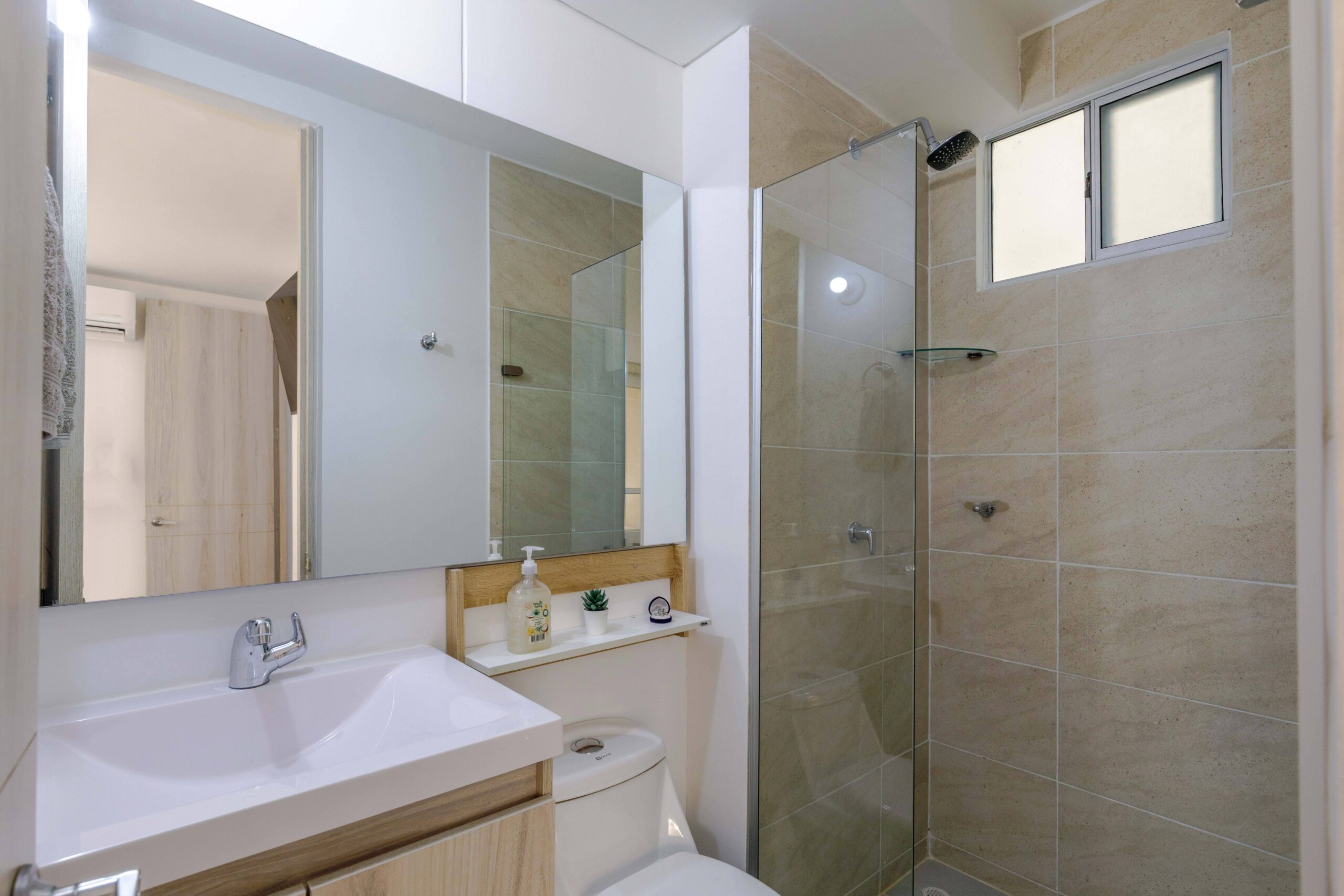 Al salir de la habitación auxiliar, encontrarás una amplia sala-comedor que conecta con una zona de estudio equipada con un sofá cama tipo nido, ideal para visitas o para quienes necesiten un espacio adicional. La habitación principal, ubicada al final del pasillo, incluye su propio baño privado, aire acondicionado y un elegante walking closet, brindando el máximo confort y privacidad.