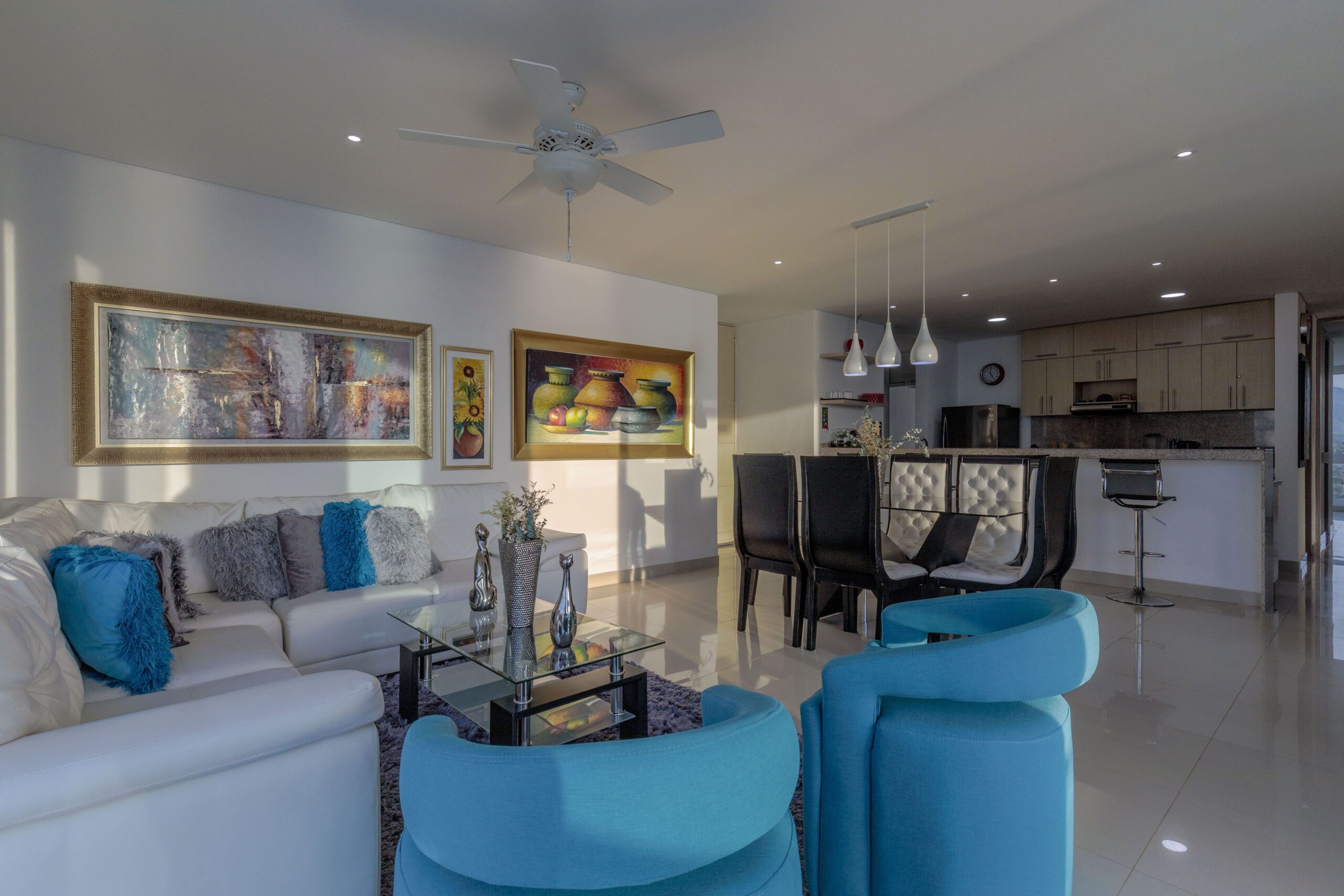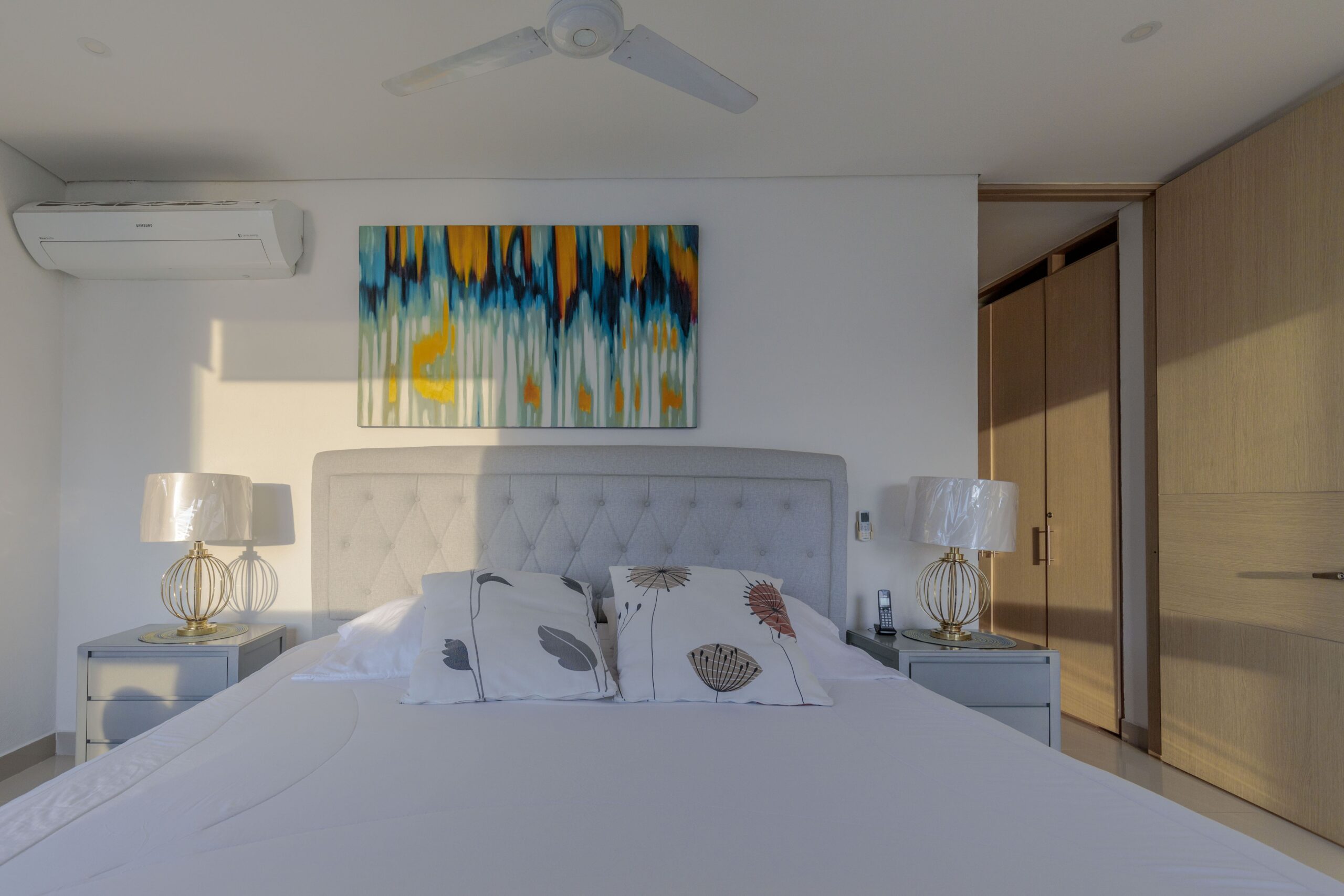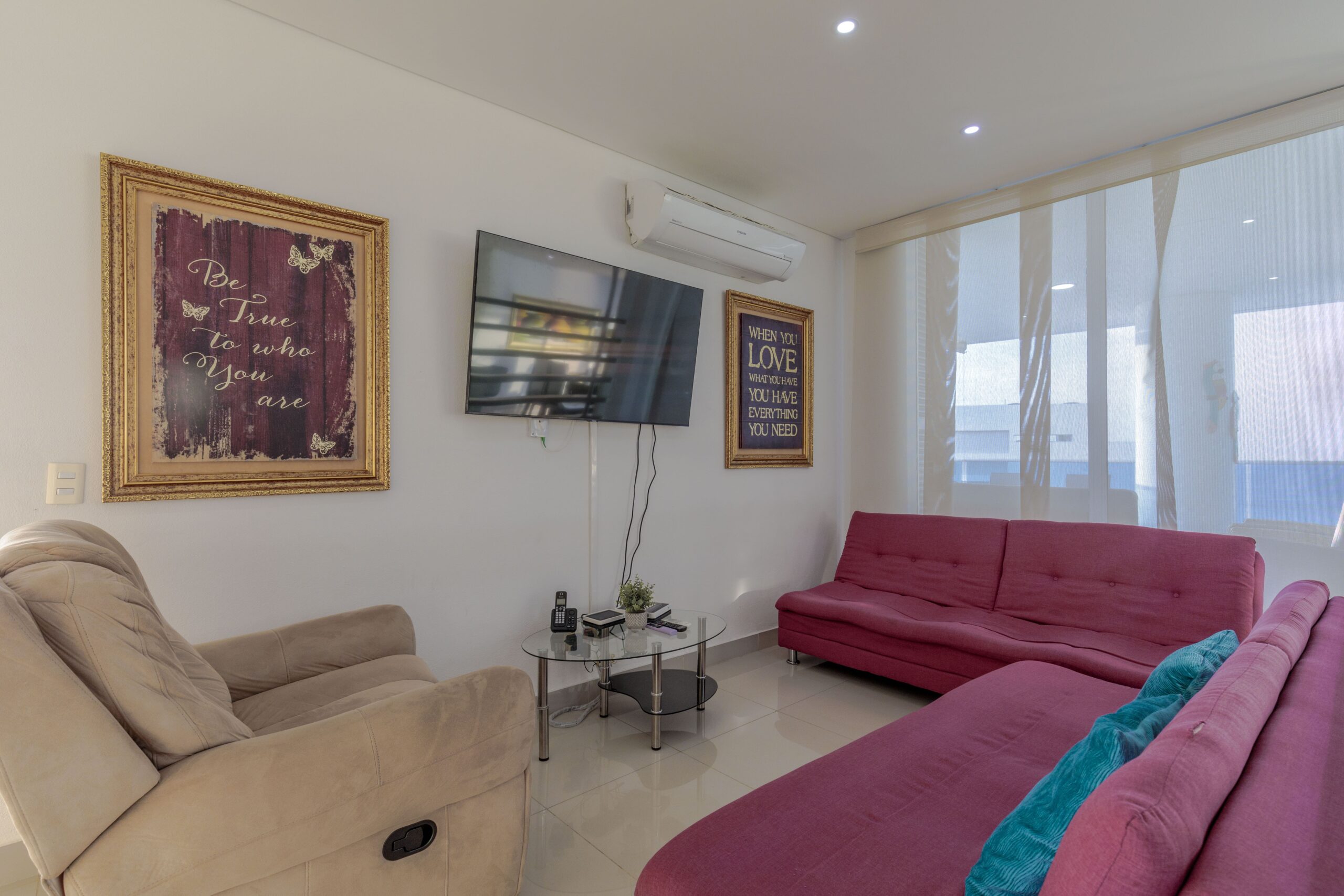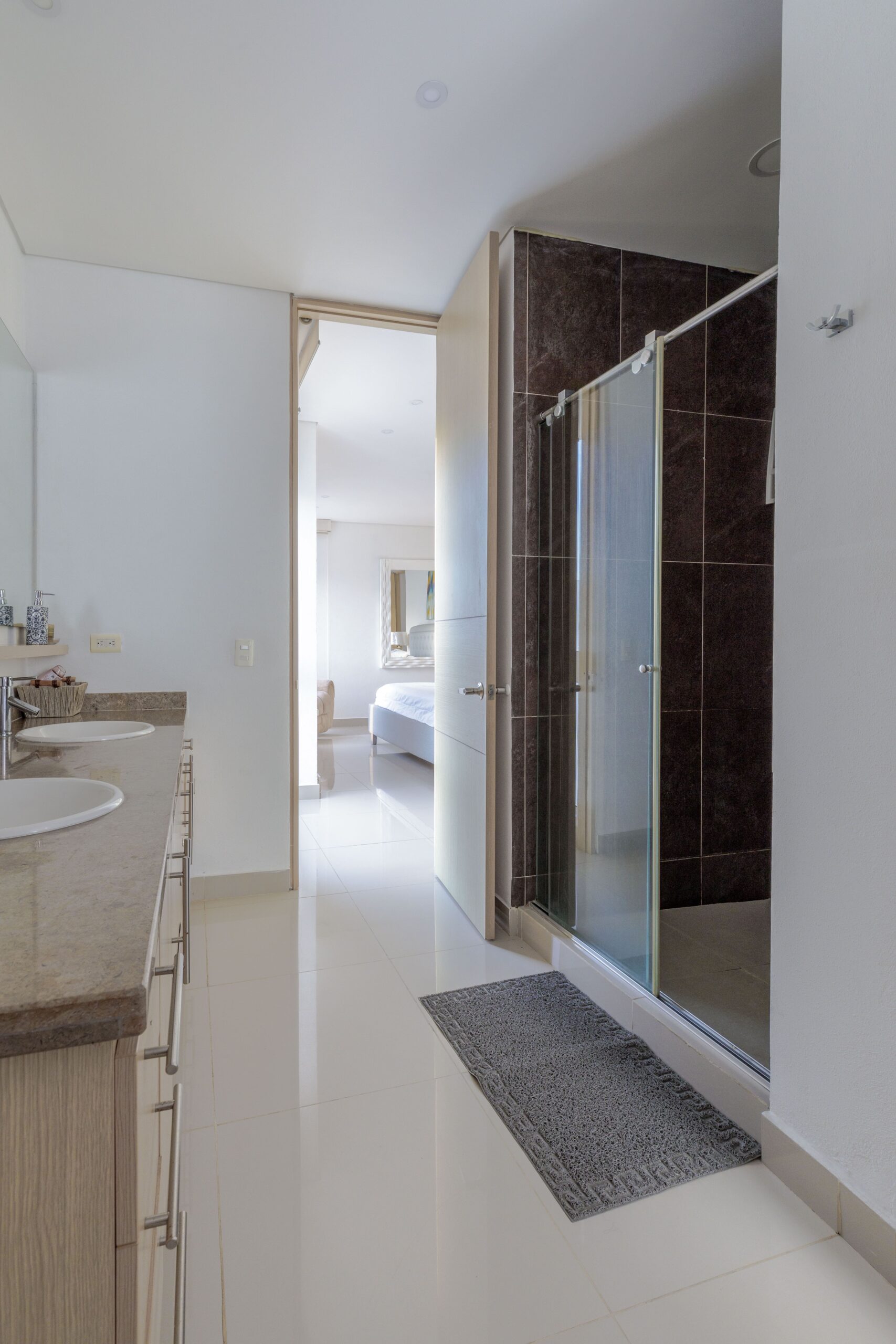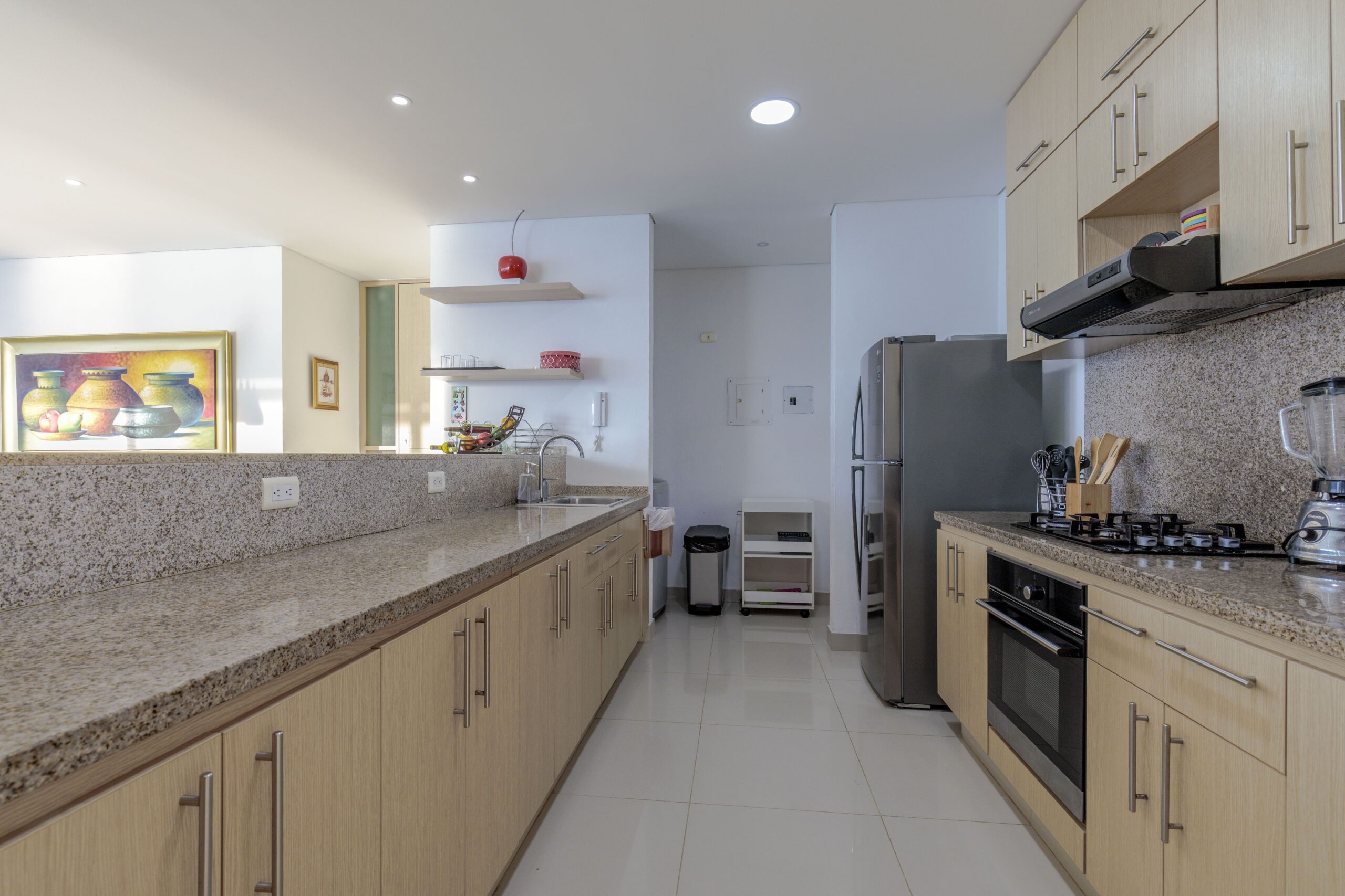 El apartamento dispone de 3 habitaciones, cada una con su propio baño interno. La sala de estar está equipada con dos sofás cama, conexión Wi-Fi, y televisión, y cuenta con un baño de visitas adicional. Además, el apartamento está climatizado con aire acondicionado central en todas las habitaciones. La cocina está completamente equipada con todos los implementos necesarios y ofrece un amplio espacio para las comidas. También incluye una lavadora y utensilios de aseo para tu conveniencia.