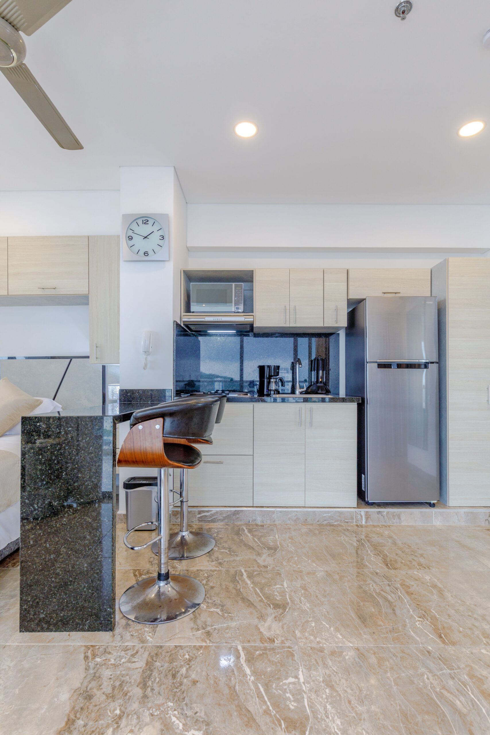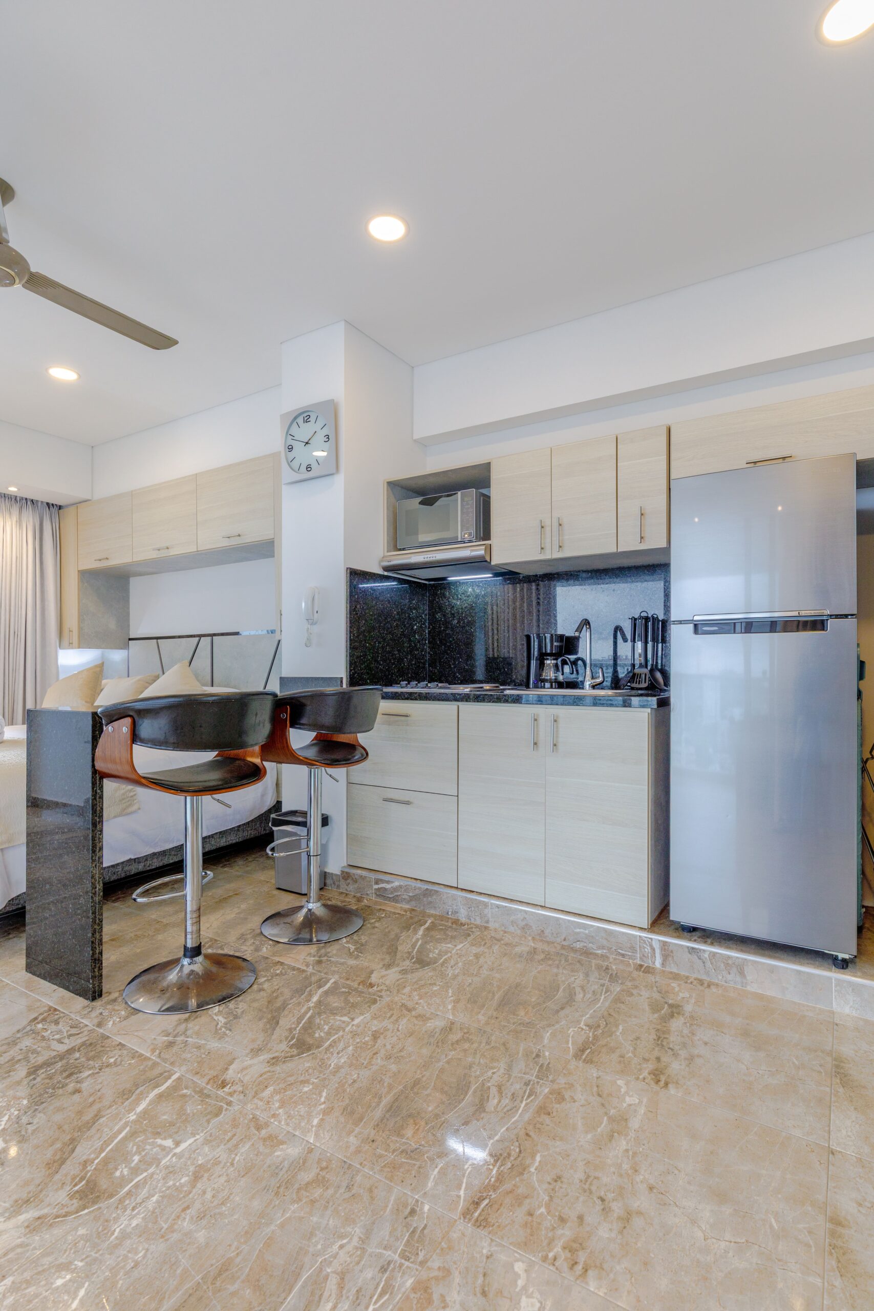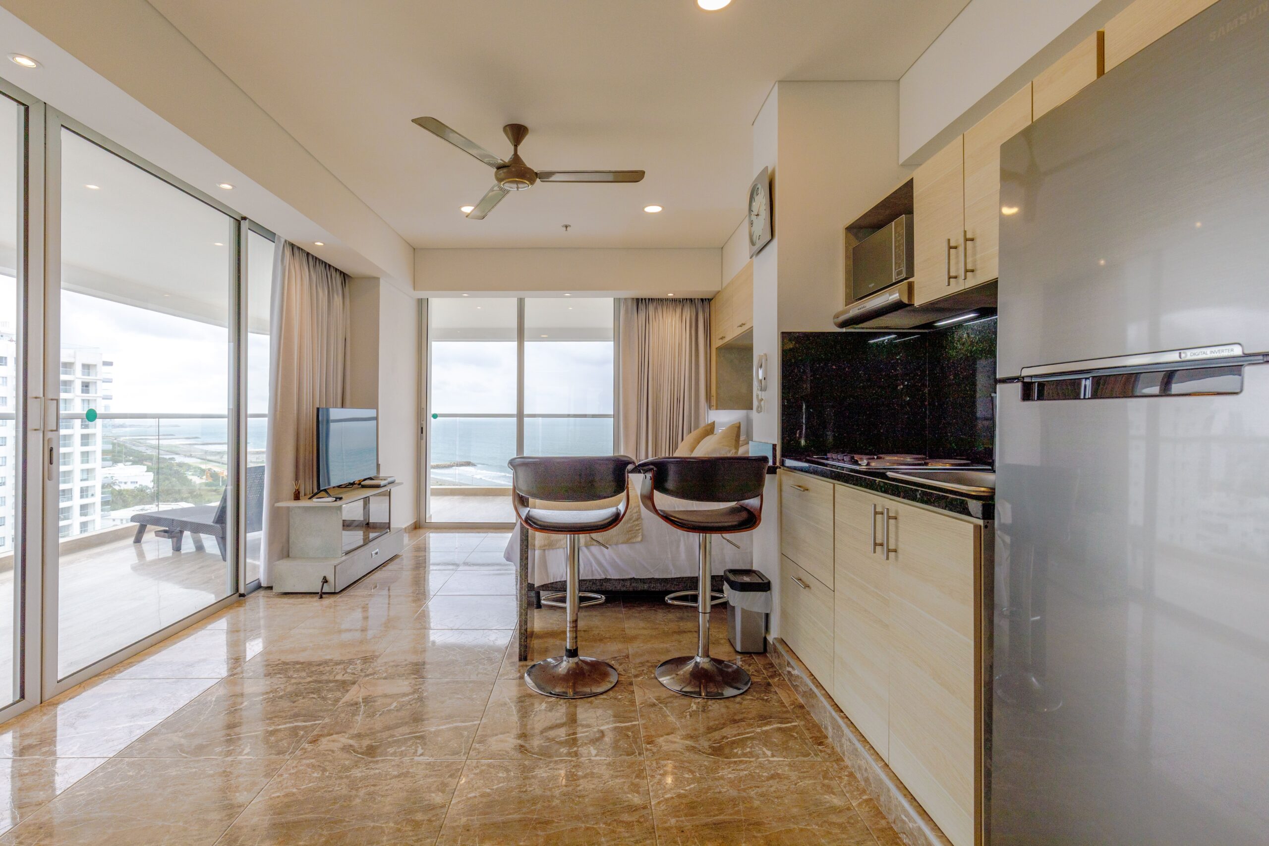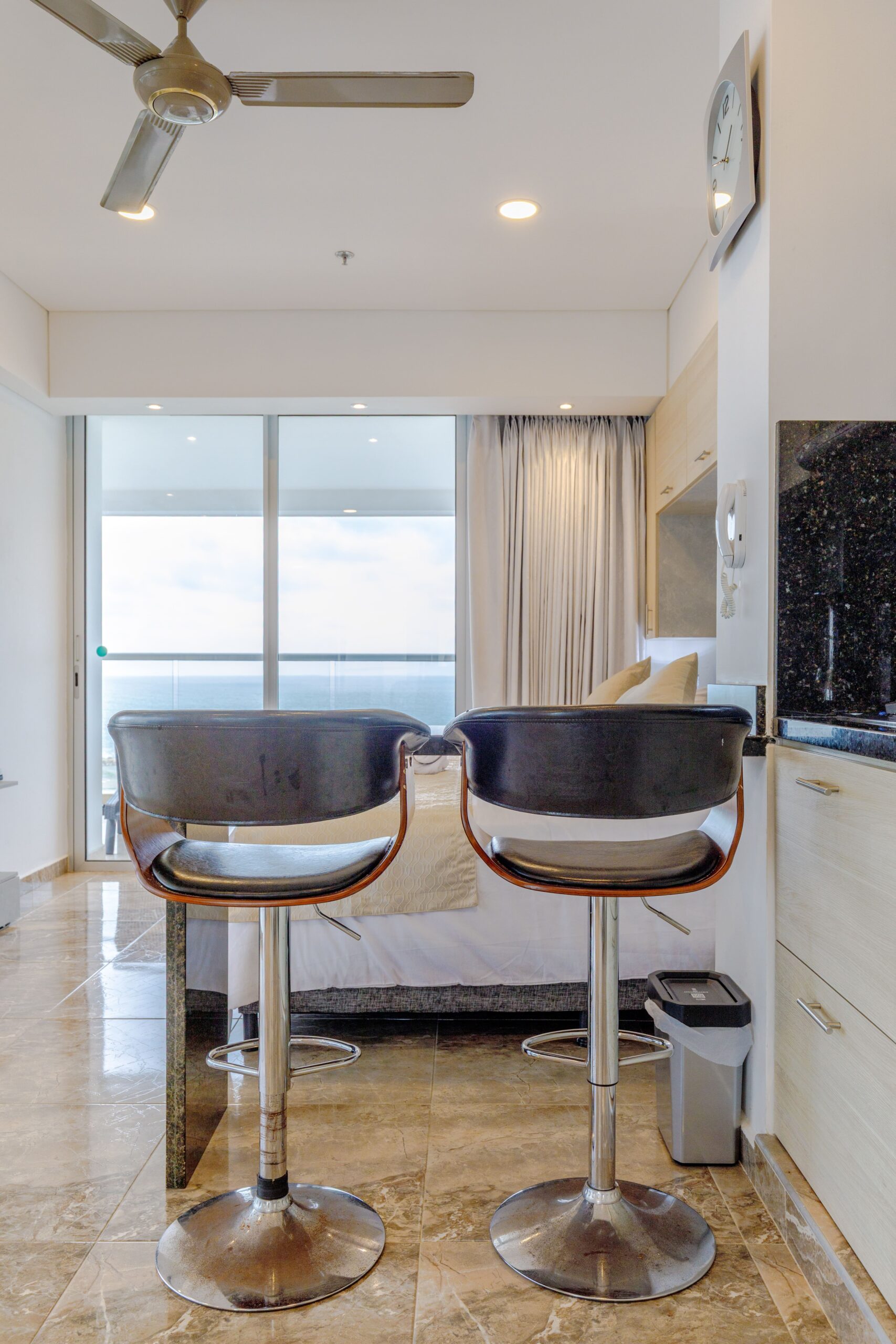 • Barra con dos sillas altas, perfecta para desayunar con vista al mar o trabajar cómodamente.