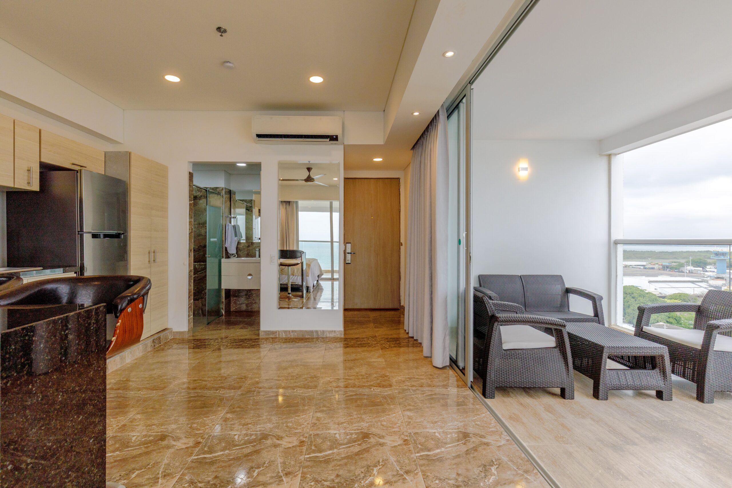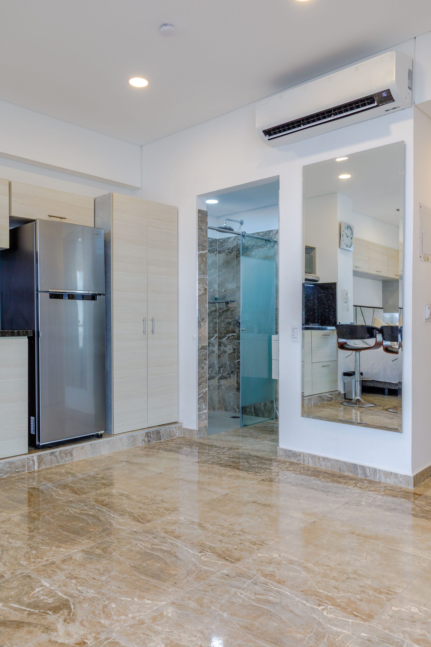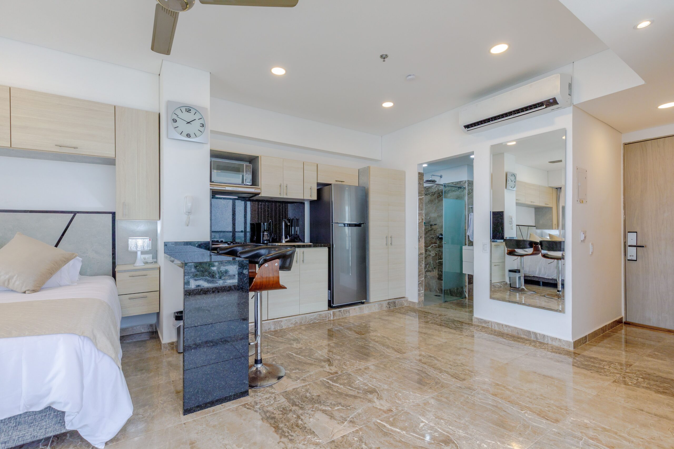 Nuestro apartamento cuenta con un sistema de ahorro energético que funciona con la llave: al retirarla, se corta automáticamente la energía para evitar consumos innecesarios. Por eso entregamos una sola llave. Te recomendamos colocarla al llegar para que el aire acondicionado enfríe el espacio mientras te instalas.