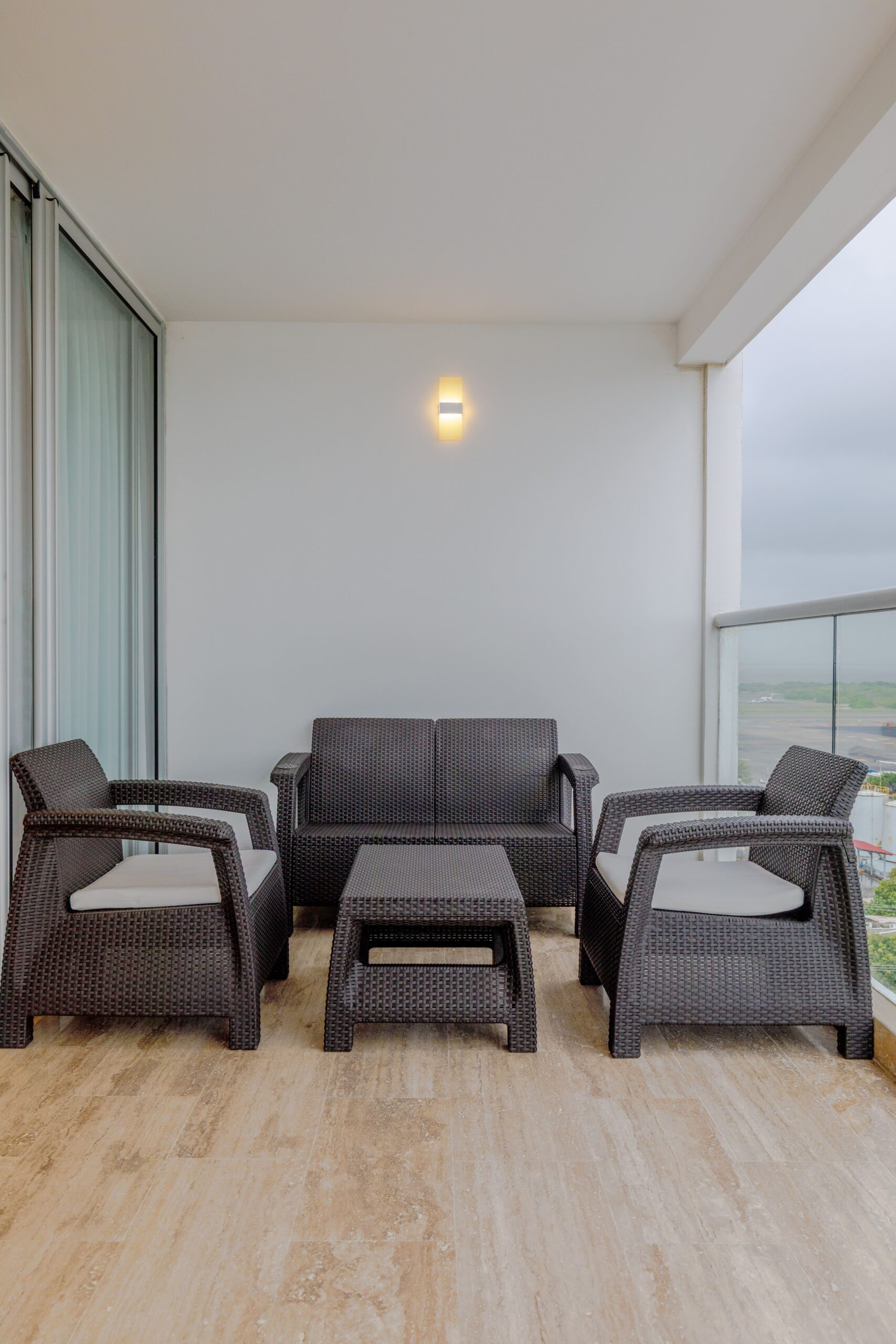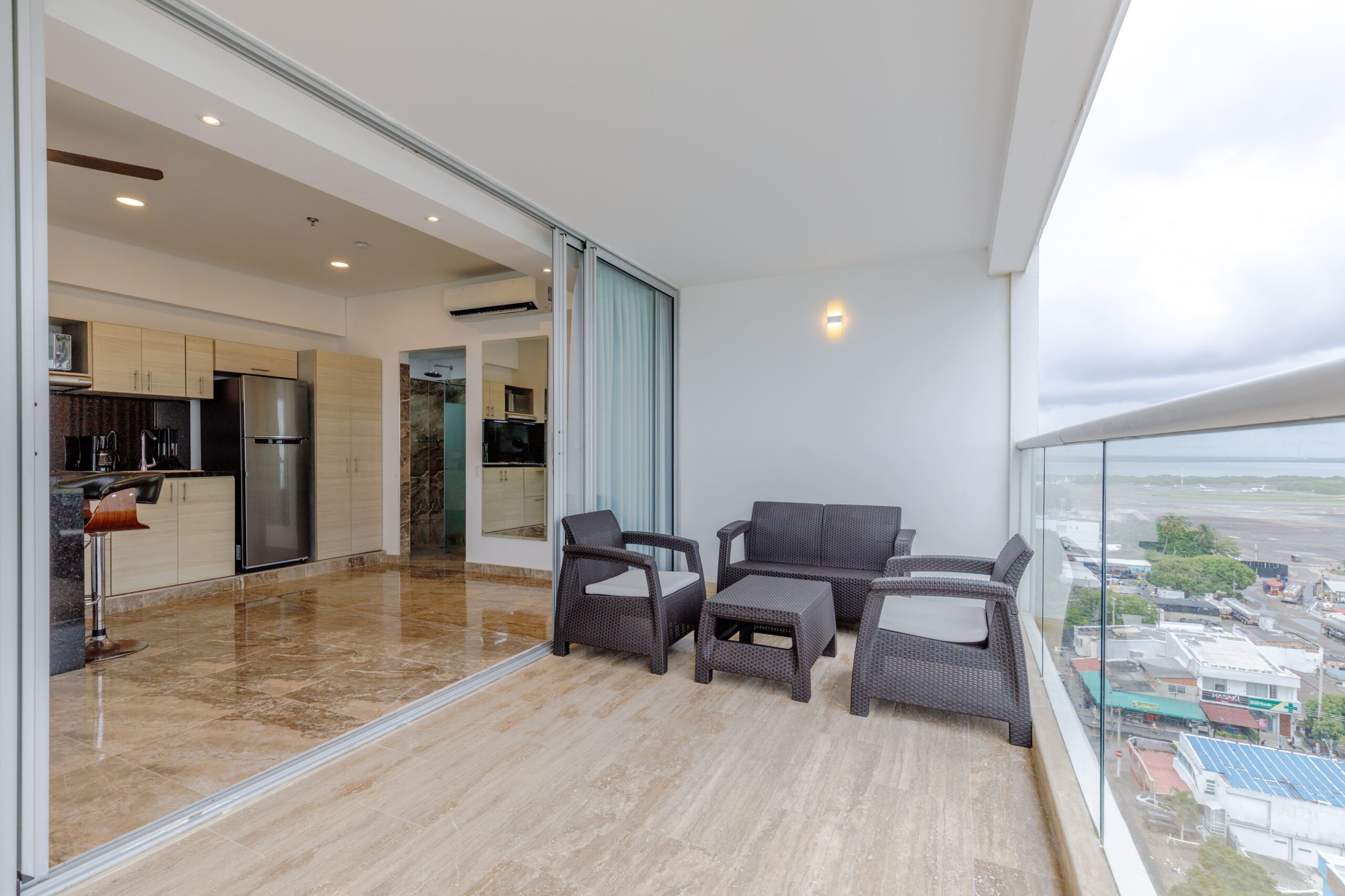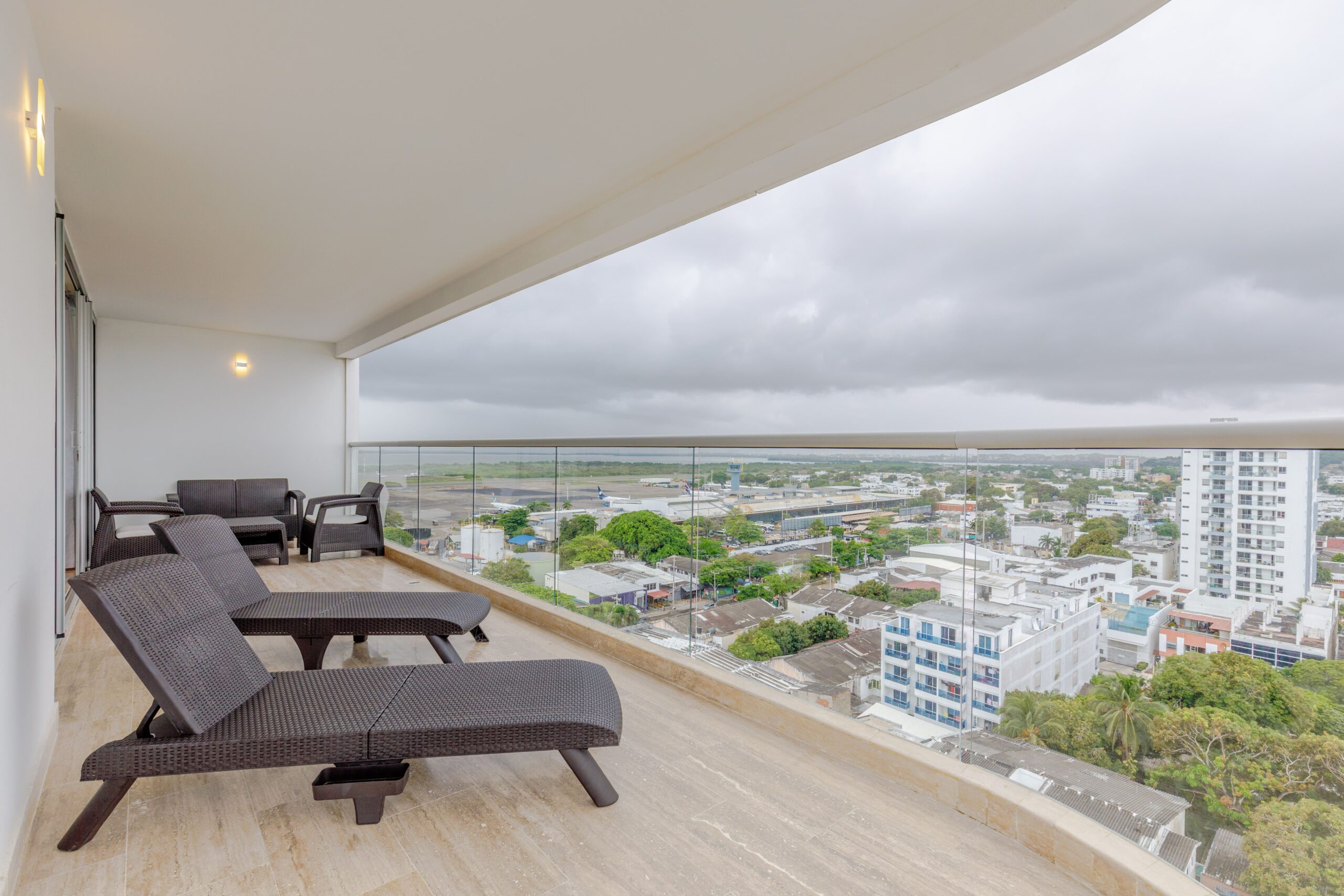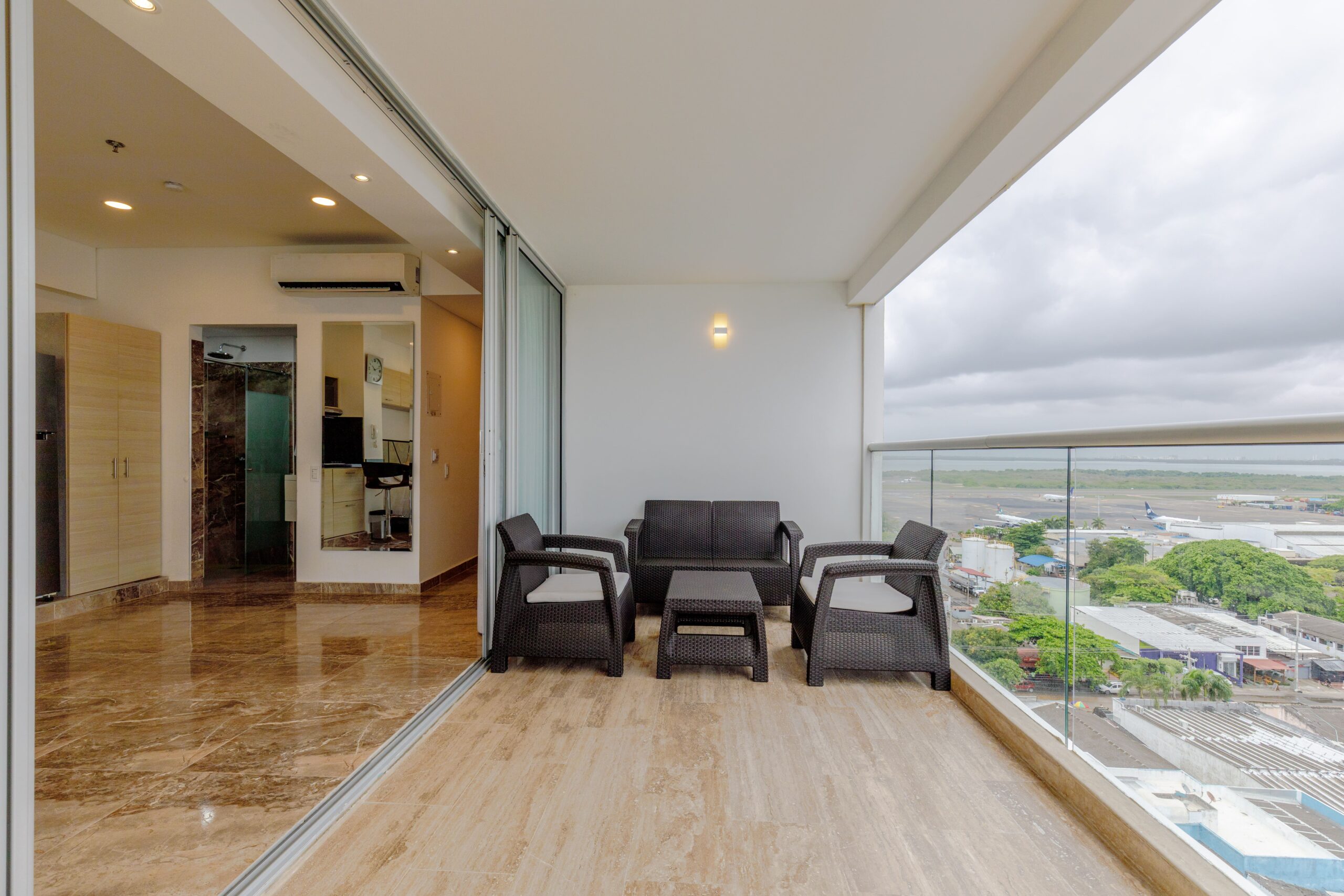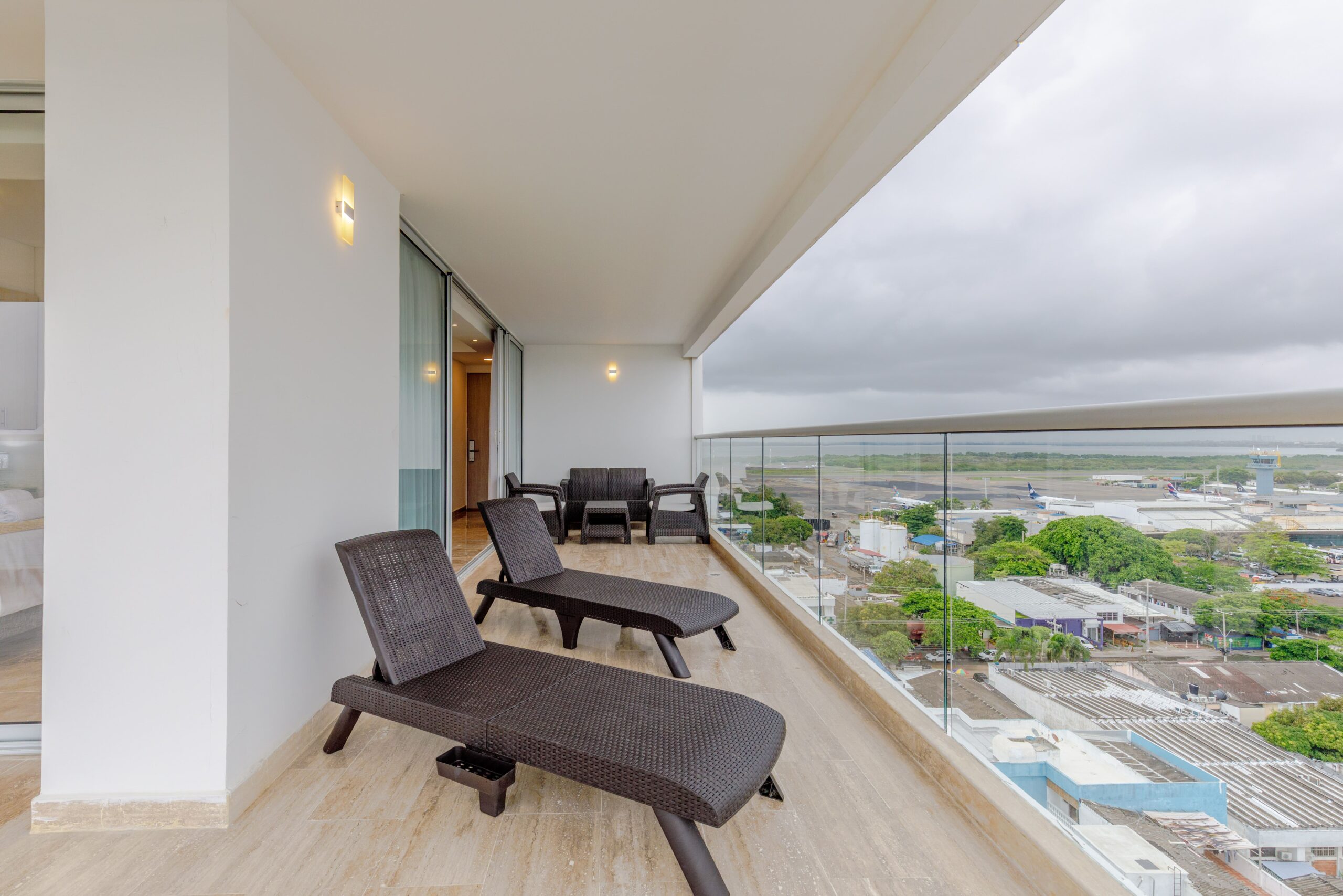 Al ser una suite esquinera, cuenta con un balcón amplio que rodea todo el alojamiento, ofreciendo vistas espectaculares al mar y a la pista de aterrizaje. Es el lugar ideal para relajarte en la sala exterior o tomar el sol en nuestras asoleadoras.